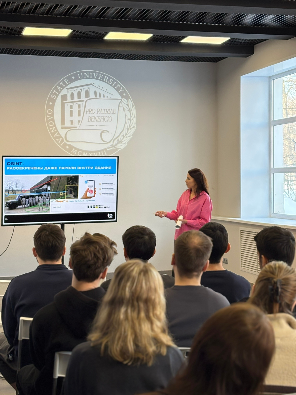 Перед студентами выступила представитель компании Т2, которая подробно разобрала актуальные угрозы в цифровой среде и методы противодействия мошенникам.