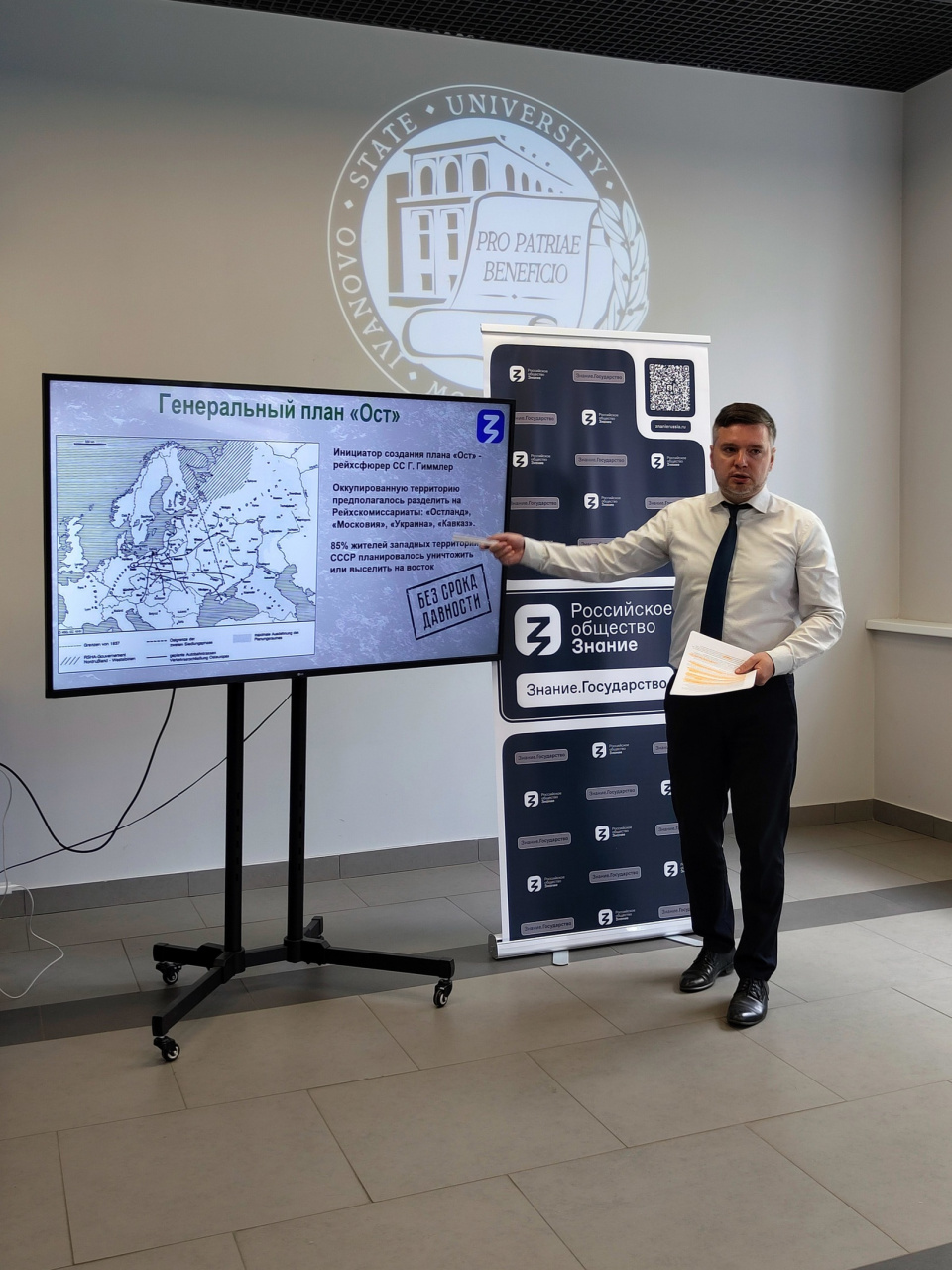 В Год защитника Отечества и 80-летия Победы в Великой Отечественной войне в рамках деятельности Общества «Знание» и проекта "Я горжусь.Герои" для студентов, преподавателей и сотрудников Ивановского государственного университете состоялась лекция «Без срока давности: преступления нацистов против советских граждан».