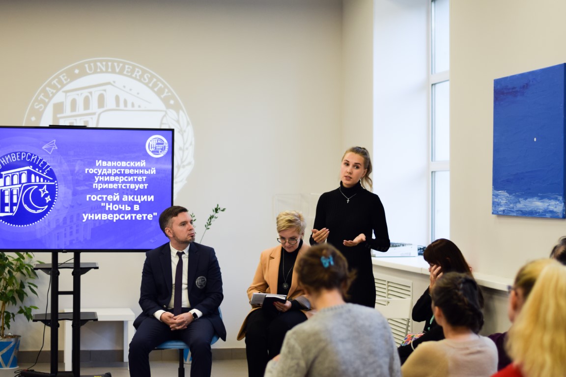 The “Night at the University” action was invented by a 2nd year student Anastasia Lenets, a participant in the “Your Move” contest (NGO “Russia – a Land of Opportunities”), who herself spoke to our guests. And then a large and varied program awaited them. After a general excursion to the Literary and Local Lore Museum "Writers of the Ivanovo Territory", the children went to the assembly hall, where our student activists held entertaining master classes with them: 1) "Creating a unique design for your fabric by decorating a sheet of paper with "avant-garde""; 2) "Creating a rag doll and studying the specifics of Ivanovo fabric"; 3) "Study of the Palekh lacquer miniature"; 4) "Acquaintance with the cities of the Ivanovo region, their cultural and history through work with the map"; 5) "Dance break". And adults at this time talked in the "Boiling Point" on topics relevant to them with representatives of various structures and services: Fedoseyeva O.V., head of the regional executive committee of the ONF in the Ivanovo region; Kolesnikova I.R., specialist of the regional branch of the Pension Fund; Shnyrova OA, lawyer of the service of the Commissioner for Children's Rights of the Ivanovo Region; Filkina A.N., consultant-lawyer of the service of the regional Commissioner for Human Rights; Kulikova Ya.A., Head of the Legal Clinic of IvSU.