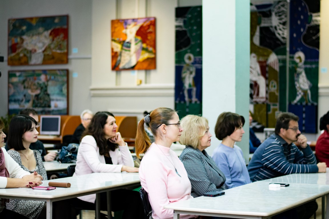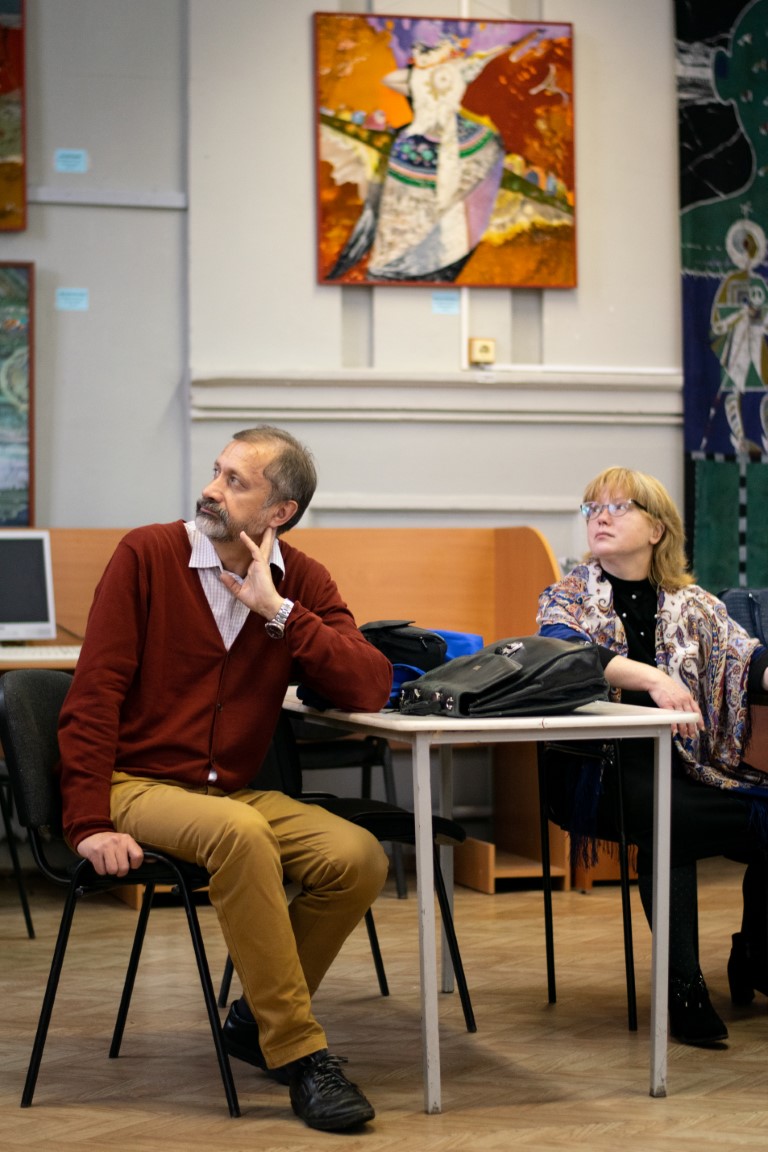 The curator of the project Sofya Lukyanova held a traditional competition for a sweet prize with those present, but this time the question was very serious: "Find three signs of the implementation of the national code in the paintings of Irina Kazimirova". Nadezhda Vasilyevna Usoltseva, who needs no introduction, brilliantly and almost instantly coped with the task, giving a simply cultural commentary in her answer!
