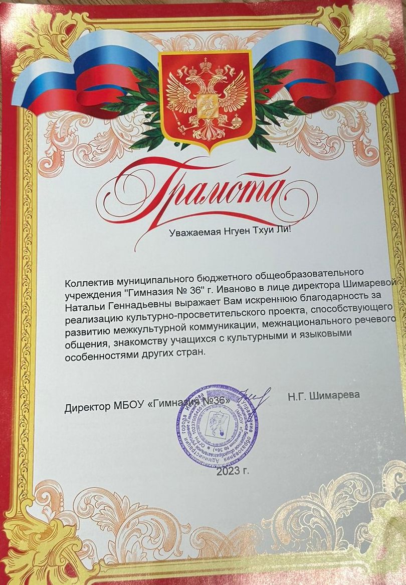The meeting of our Vietnamese students and students of the gymnasium became a dialogue in Russian between representatives of such different folk cultures, brought a lot of positive emotions and, undoubtedly, stimulated interest in knowing the unknown in the world, as well as respect for the native culture and the culture of other peoples. On this day, the students acquired an extremely important experience and the most pleasant impressions from communicating with Russian schoolchildren. In parting, Li and Ding received gratitude from the director of the gymnasium for the implementation of a cultural and educational project that promotes the development of intercultural communication, interethnic speech communication, acquaintance of students with the cultural and linguistic characteristics of other countries, as well as memorable Russian souvenirs.