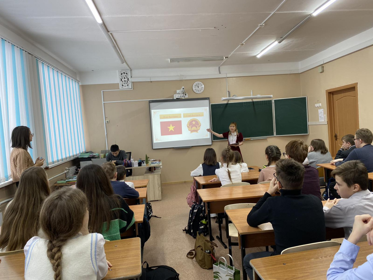 On a gloomy winter day on February 6, in one of the classes of the Ivanovo gymnasium No. 36, it was unusually festive, warm and light! Vietnamese students Nguyen Thuy Ly (2nd year of the Master's program in the educational program "Philology") and Hung Dinh Quoc (3th year of the bachelor's degree in the educational program "International Relations") under the guidance of Associate Professor of the Center for Russian Studies and International Education R.N. Kanafieva visited Russian schoolchildren to tell them about the traditions of celebrating the Lunar New Year – an exotic and magnificent event in a number of countries in Southeast Asia.