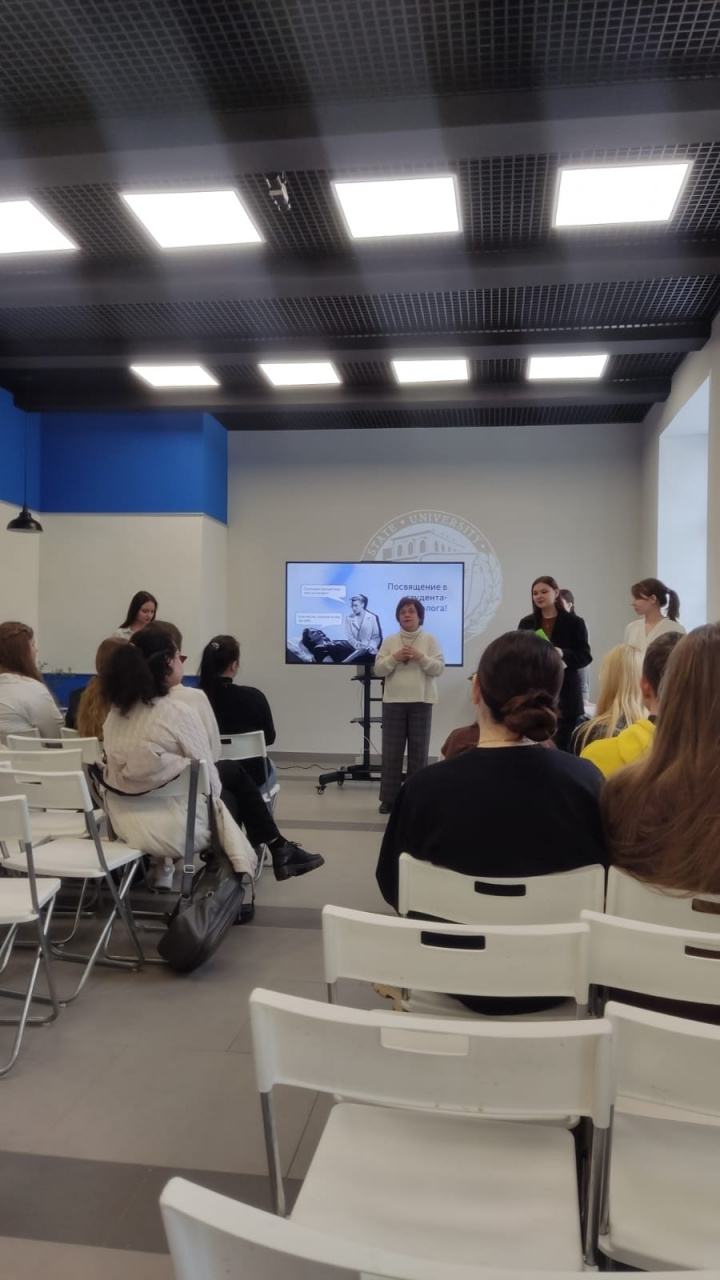 Сегодня студентки 3-го курса Оля Курлапова, Полина Киселева, Светлана Пуговкина, Елена Рыжова под руководством куратора первого курса, доцента кафедры Елены Игоревны Сушковой официально приняли первокурсников в психологи.