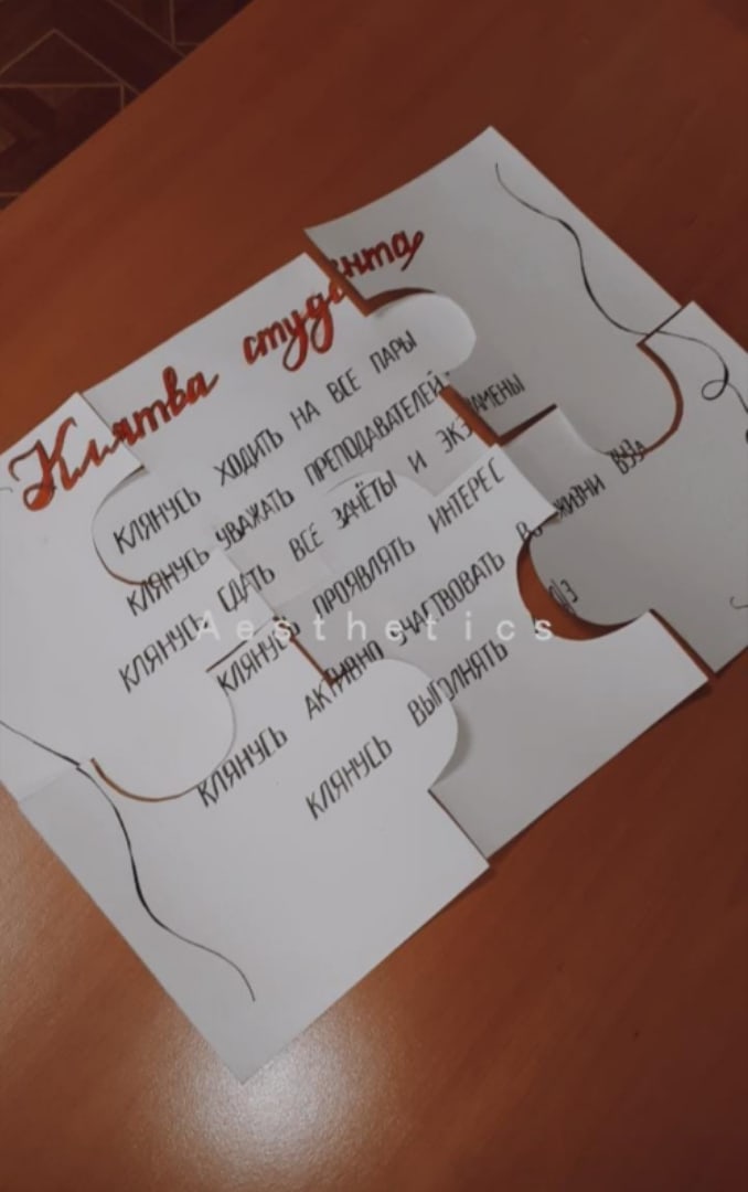 В завершение каждой игры ребята получали часть пазла. Сам пазл представлял собой «клятву студента», которую группа зачитывала в конце прохождения квеста. Для ощущения завершенности мы устроили чаепитие, во время которого смогли ответить на интересующие вопросы наших первокурсников. Надеемся, что этот интерактив был веселым и полезным времяпрепровождением для всей группы.