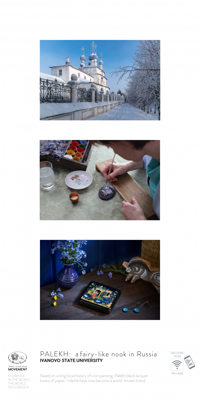 Для международной интерактивной фотовыставки во Флоренции команда ИвГУ (студенты Д. Демидова, А. Соколова, А. Низова, А. Гусева, научные руководители доц. Е.А. Шилова и доц. Е.М. Григорьева, художественные руководители (предоставление фотоматериалов) доц. Д.С. Докучаев и преп. А.В. Леонов) подготовила постеры с цветными иллюстрациями и подробной культурологической справкой по нескольким темам: «Православные жемчужины Ивановской области», «Народные художественные промыслы Палеха», «Конструктивизм в архитектуре Иванова» – и др. Постеры снабжены специальным NFC-кодом, который считывается смартфоном или любым другим «умным» гаджетом и позволяет моментально получить ссылку на специальный раздел фестивального сайта, посвященный Центральной России и, в частности, Ивановской области.