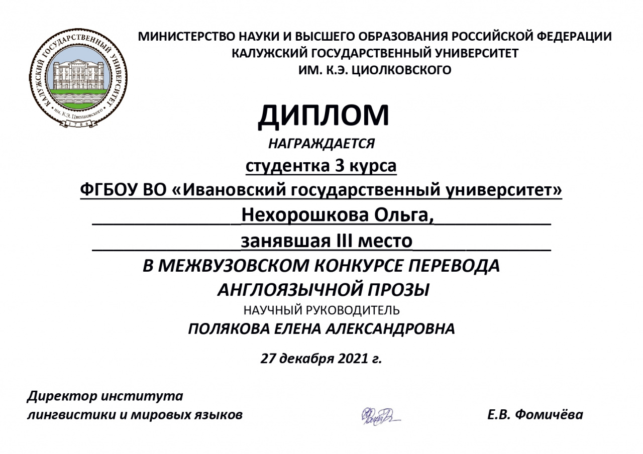 Поздравляем Нехорошкову Ольгу, студентку 3-го курса направления подготовки 45.03.01 Филология (Зарубежная филология), занявшую III место в межвузовском конкурсе перевода англоязычной прозы!