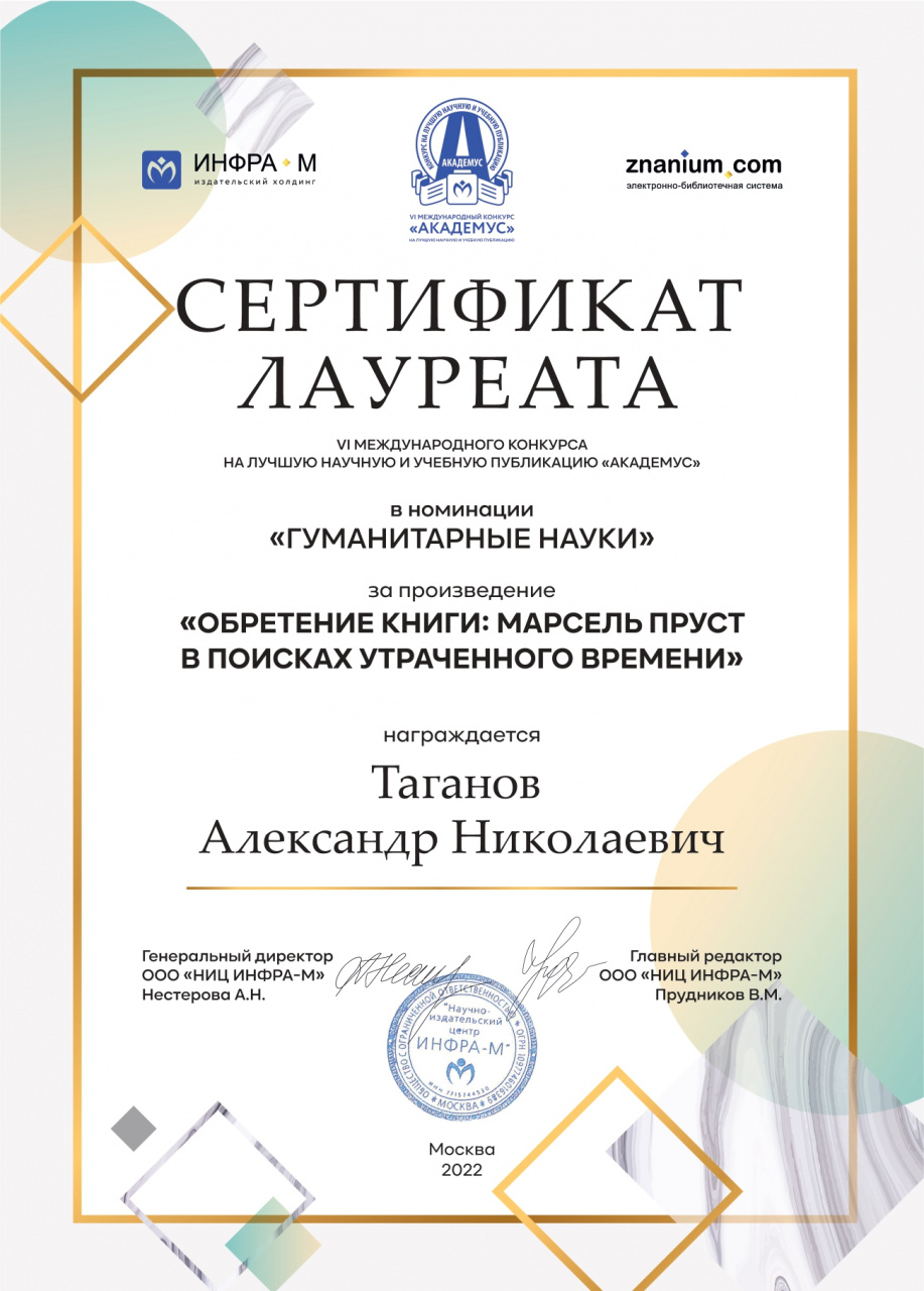 В Московском издательстве «ИНФРА-М» в серии книг «Научная мысль» вышла новая монография доктора филологических наук, профессора кафедры зарубежной филологии Института гуманитарных наук ИвГУ Александра Николаевича Таганова «Обретение книги: Марсель Пруст в поисках утраченного времени».
