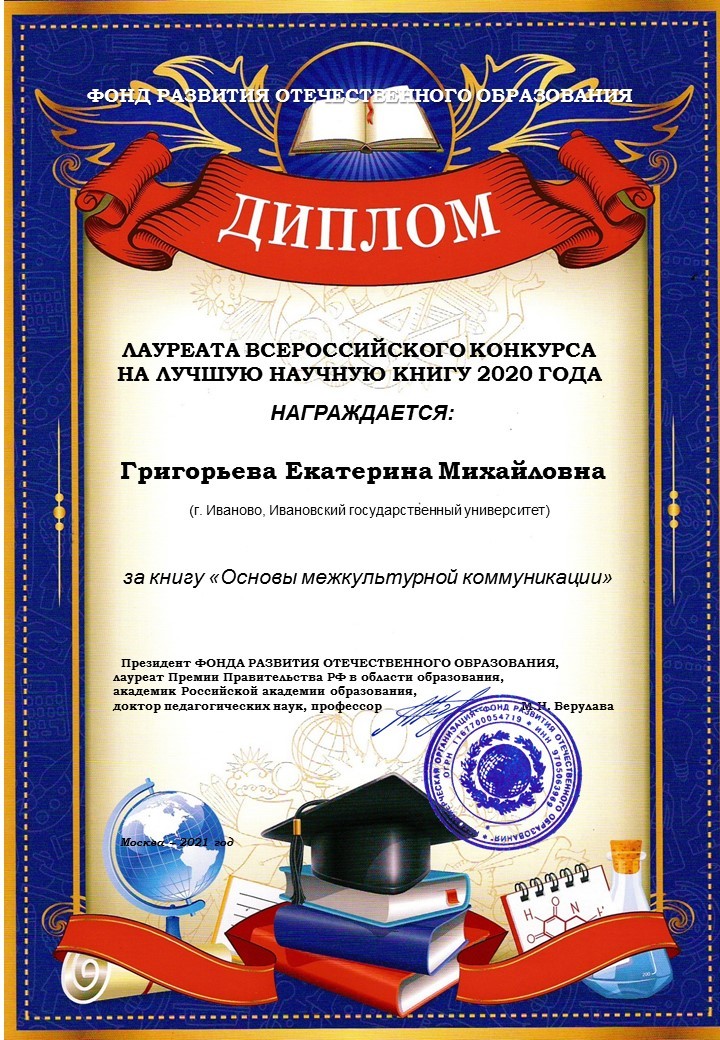 В рамках Всероссийского форума «Неделя вузовской науки» (6–11 сентября 2021 г.) прошло онлайн-награждение победителей Всероссийского конкурса на лучшую научную книгу 2020 г. В номинации «Гуманитарные науки» доцент кафедры зарубежной филологии, кандидат филологических наук Екатерина Михайловна Григорьева стала лауреатом конкурса за учебное пособие «Основы межкультурной коммуникации».
