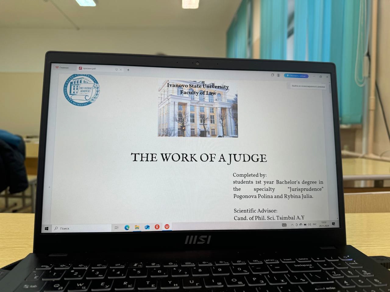 Студентам были предложены различные задания тестового характера, диктант и даже юридическая викторина на английском языке. Кроме того, студенты 1 курса (группы 1 и 2) выступили с устными презентациями, приуроченными ко Дню юриста. Студенты подготовили увлекательные мультимедийные проекты и устные выступления на английском языке, в основу которых легла информация о профессиях в сфере юриспруденции и реальных случаях из профессиональной жизни их представителей.