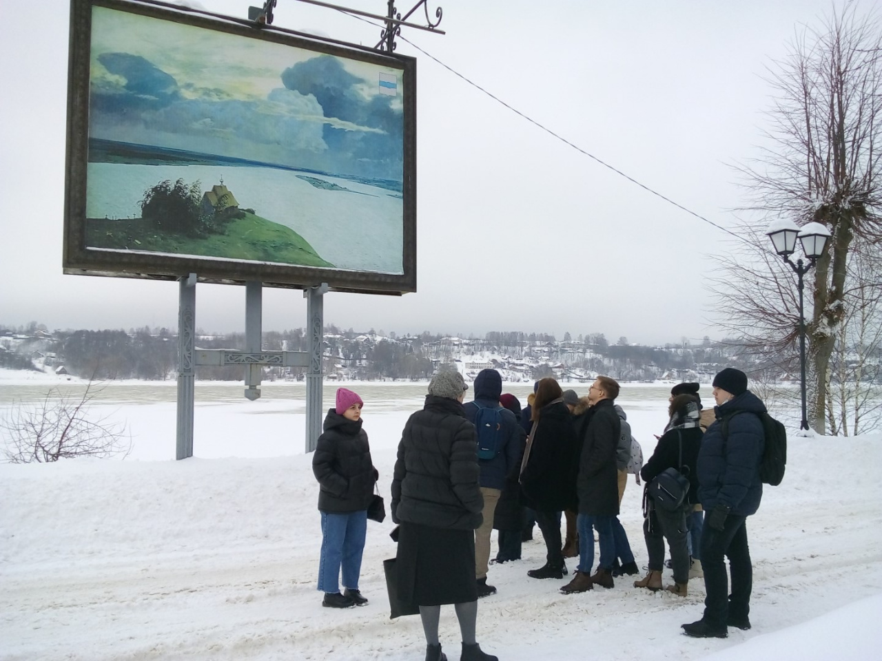 Алла Волкова: Юрьевец показался мне довольно мрачным и пустым: покосившиеся дома, серое небо, безлюдные улицы, старые пожелтевшие вывески на зданиях. Радует, что он оживает раз в год, когда проводится фестиваль «Зеркало» имени Андрея Тарковского. Но что порадовало мой взор – так это Волга. Было немного страшно прогуливаться по льду, засыпанному снегом, поэтому, сделав несколько фотографий на память, мы двинулись в музей братьев Весниных. Это уже был конец поездки, поэтому я немного утомилась, но все равно было интересно послушать про этих людей и про проекты, которые они создавали. Поездка закончилась неожиданно приятным чаепитием с пиццей и ананасовым печеньем, которое всем очень понравилось.