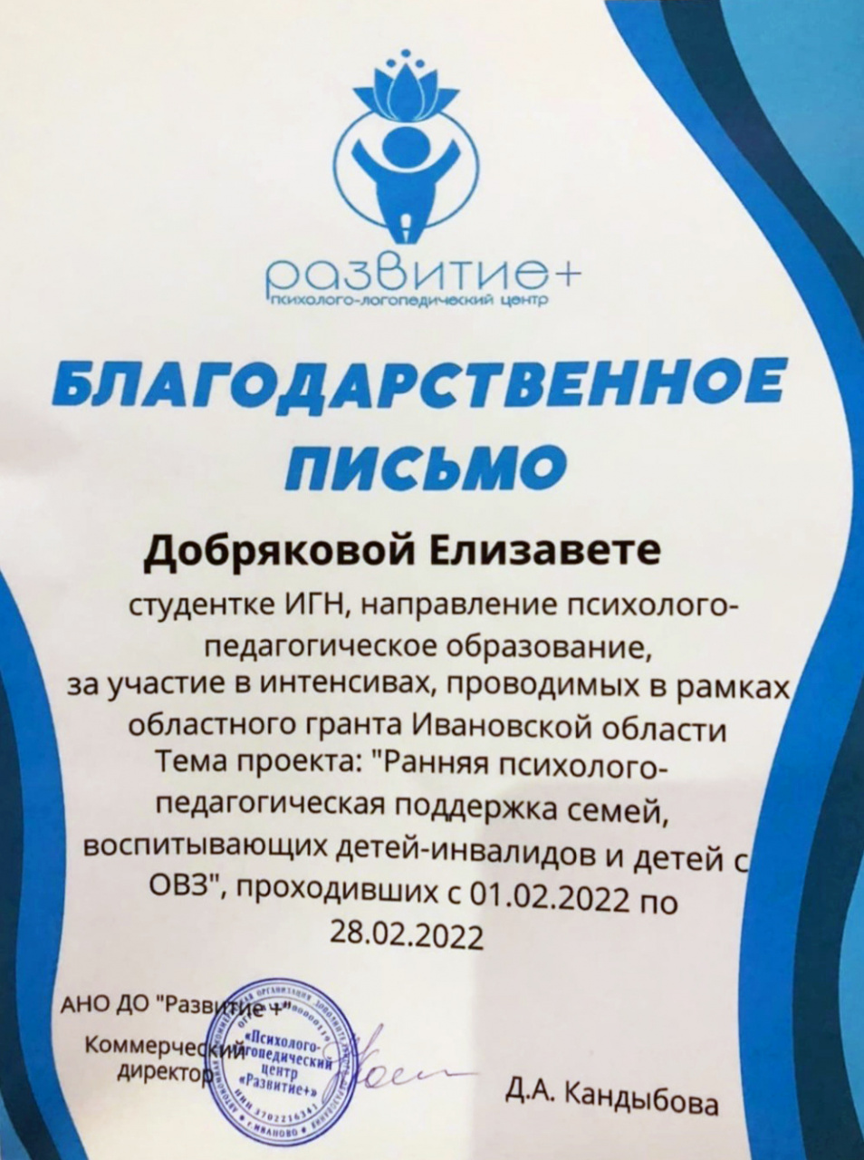 28 марта директор психолого-логопедического Центра «Развитие» М.Л. Жукова вручила благодарности студентам 2-го и 3-го курсов ИГН (специальность «Психолого-педагогическое образование») за работу в качестве волонтеров в рамках реализации Ивановского областного гранта «Ранняя психолого-педагогическая поддержка семей, воспитывающих детей-инвалидов и детей с ОВЗ».