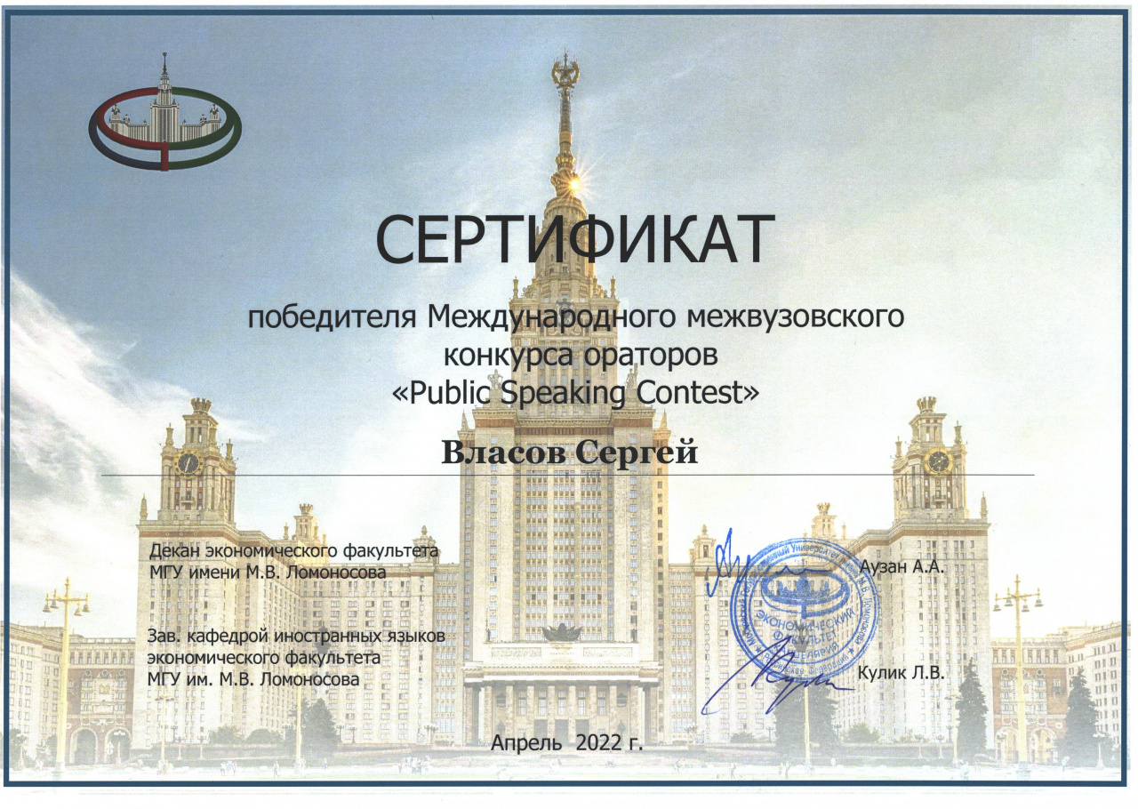 Финальный этап состоялся 5 мая и заключался в выступлении на предложенную тему без подготовки. Перед компетентным жюри, в состав которого вошли преподаватели МГУ, а также представители издательства “Cambridge University Press”, стояла непростая задача. С нашим студентом соревновались обучающиеся из МГУ, МГИМО, РГГУ, НИУ ВШЭ Санкт-Петербург и других престижных вузов. Сергею удалось продемонстрировать прекрасное владение английским языком, грамотно выстроить свое выступление, а также убедительно ответить на поставленные вопросы. Сергей победил!
