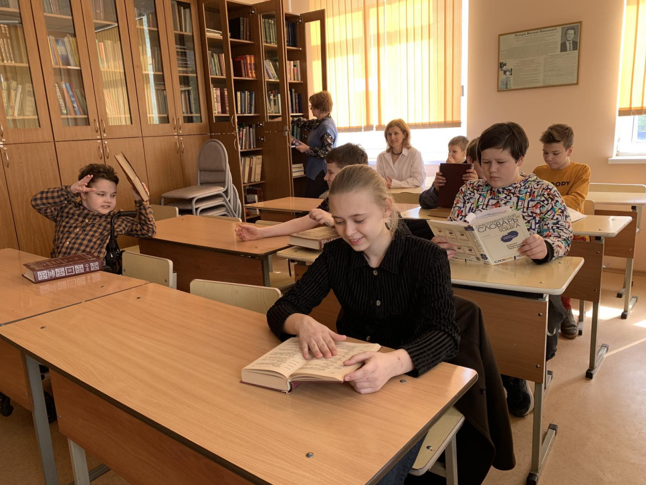 В День филолога учащиеся 6-го класса ЧОУ «Исток» в сопровождении учителя русского языка, аспиранта кафедры отечественной филологии Дарьи Сергеевны Квашниной прибыли в кабинет русского языка для знакомства с лексикографическими богатствами кафедры – лингвистическими словарями, лексическим атласом русских народных говоров и диалектологической картотекой.
