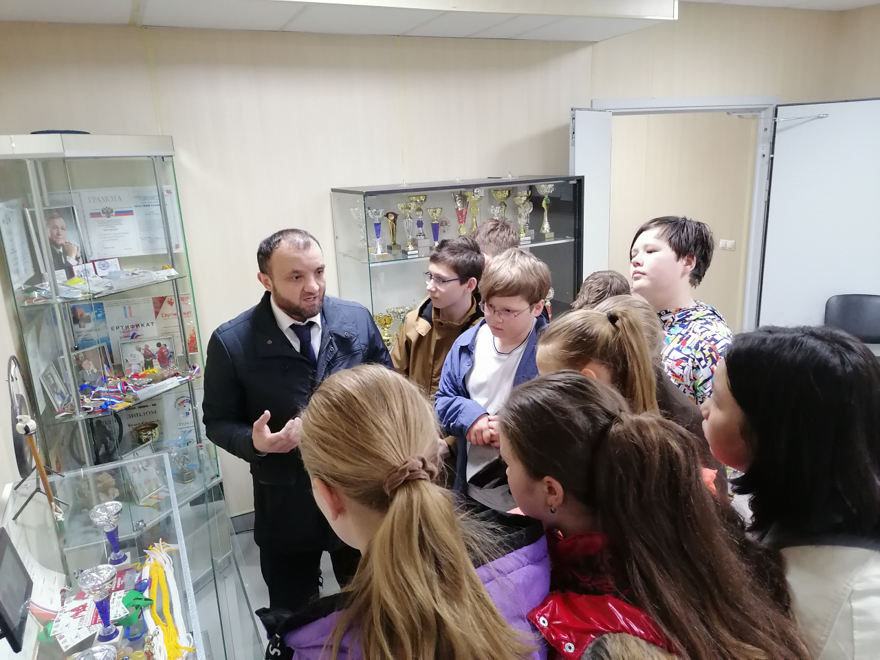 Путь к месту назначения проходил мимо спорткомплекса ИвГУ, где в тот момент как раз готовились к спортивному празднику. Пройти мимо было выше человеческих сил. Школьники не только увидели большой зал спорткомплекса, университетских спортсменов, выставку их призов и стенгазет, но и познакомились с ведущими тренерами кафедры физической культуры и безопасности жизнедеятельности ИвГУ: побеседовали с мастером спорта России по самбо доцентом Ксенией Александровной Кумировой и с основателем и президентом Федерации тайского бокса (муай-тай) Ивановской области, доцентом Айгубовым Нариманом Магомедовичем.
