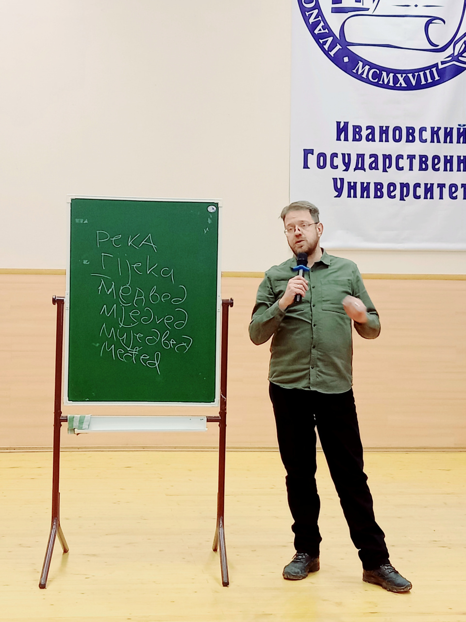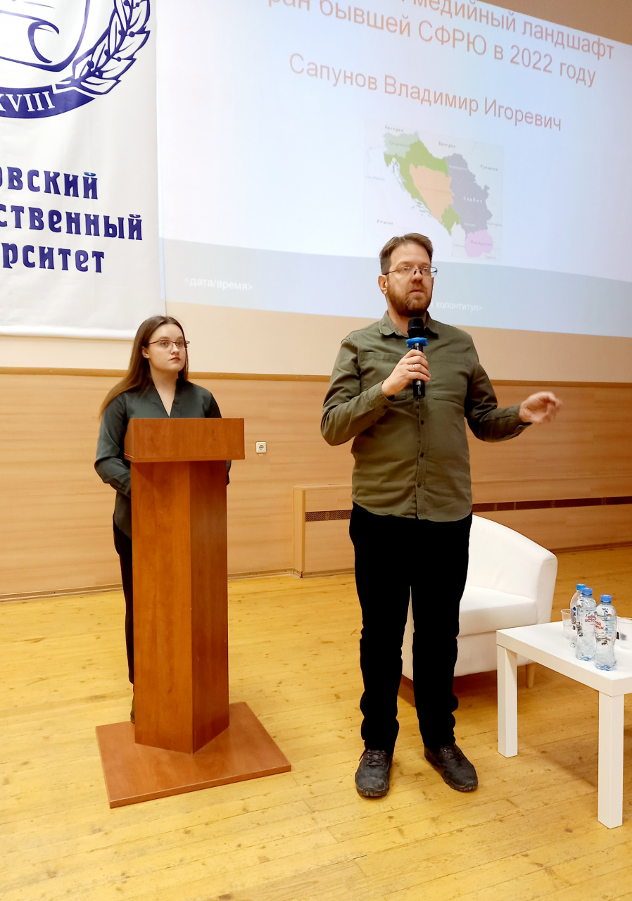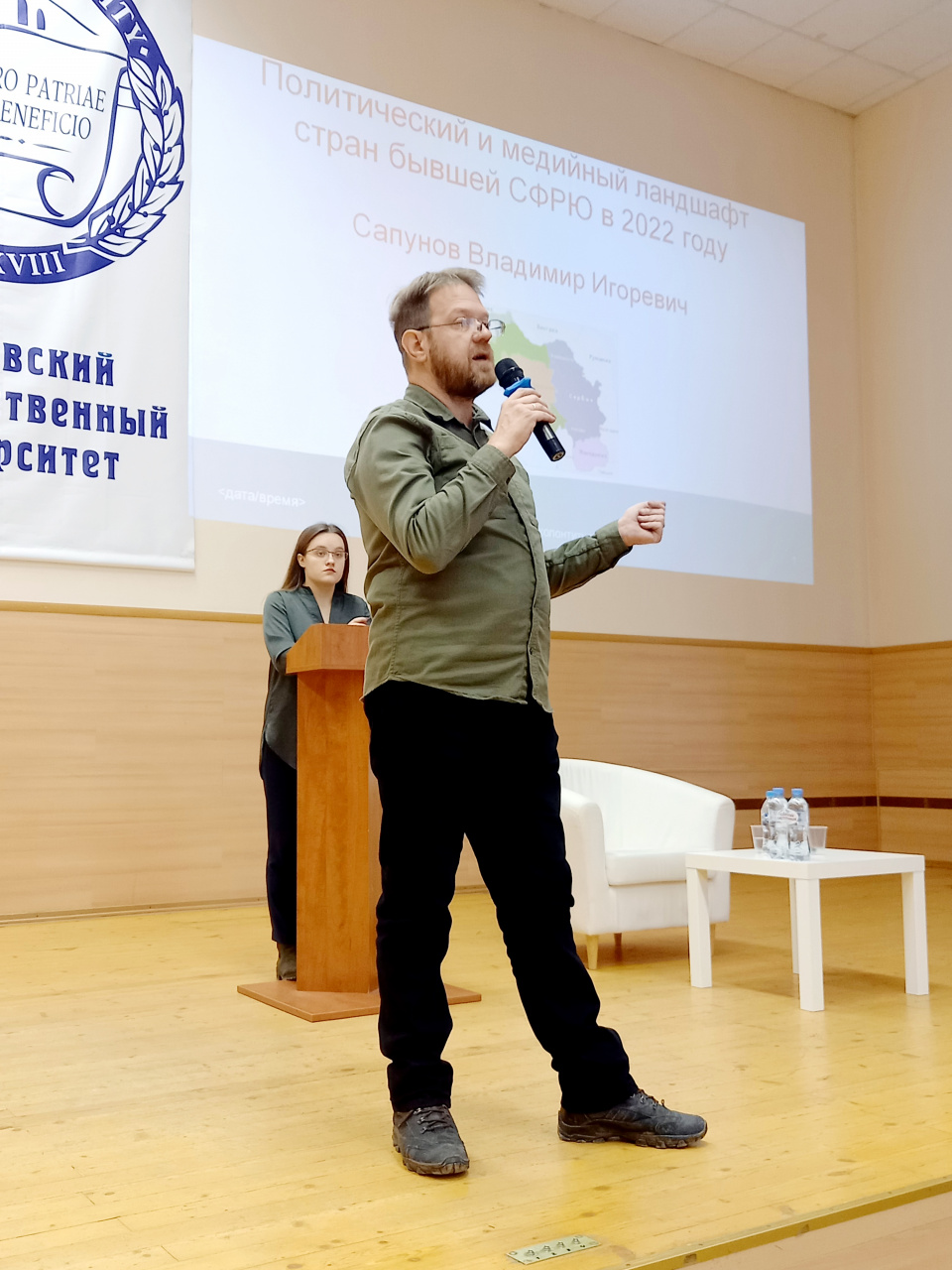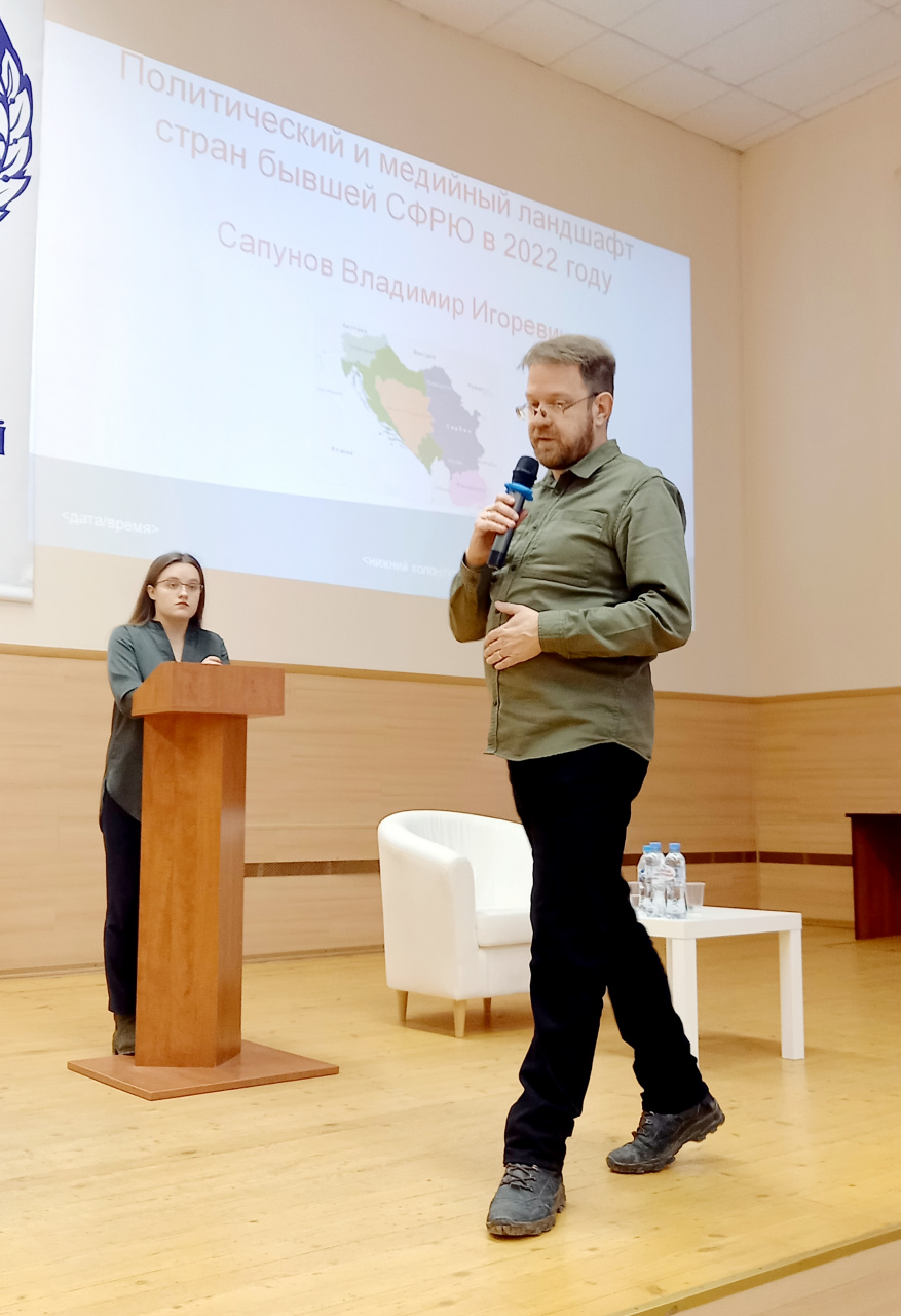 Сама лекция, посвященная современному политическому и медийному ландшафту стран бывшей Югославии, оказалась чрезвычайно интересной и познавательной – в том числе и благодаря личности лектора, совсем недавно вернувшегося после 4-месячного пребывания на Балканах. Для начала В.И. Сапунов наглядно показал (мелом на доске), как близки друг другу (и не слишком далеки от русского) языки балканских славян (существовал даже единый, пусть и с двумя нормами, сербохорватский литературный язык, после войны потерявший свой статус и ставший надъязыковым койне). В увлекательном и экспрессивном рассказе о странах, городах, событиях, политиках, рискованных журналистских поездках через границы (охраняемые одними и не признаваемые другими), встречах с информантами то явно звучало, то подспудно пробивалось главное: территория бывшей СФРЮ не случайно стала настоящим «яблоком раздора» и не случайно сербы, крещеные еще в 1-м тысячелетии н.э. и никогда не забывавшие о братской России (с многотысячными демонстрациями в ее поддержку уже в эпоху СВО), порой разбираются в наших нынешних событиях глубже многих из нас – у них есть опыт страшной гражданской войны в Югославии 90-х, раны которой не излечены до сих пор (да и вряд ли всё можно излечить…). Лекция В.И. Сапунова опиралась на огромную фактологическую базу, глубокое знание исторических, политических, социальных, культурных реалий (от биографий политиков до цен на продукты, от экономических трендов до психологии граждан того или иного города или анклава), бесценный опыт жизни там и личного общения с представителями балканских народов. О заинтересованности студентов свидетельствовали и вопросы лектору.