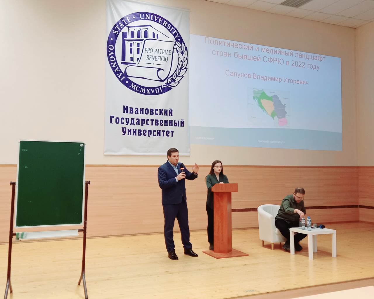 6 декабря в актовом зале 1-го корпуса Ивановского государственного университета состоялась встреча студентов направлений «Международные отношения» и «Журналистика» с известным журналистом-международником, доктором филологических наук, доцентом кафедры телевизионной и радиожурналистики Воронежского государственного университета Владимиром Игоревичем Сапуновым.