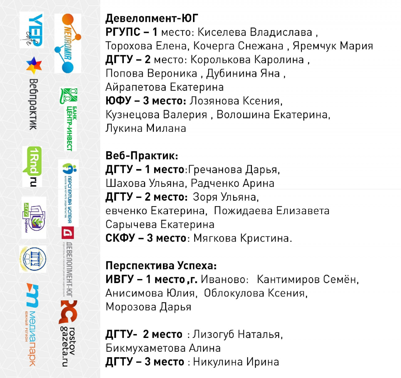 По итогам конкурса 1-е место заняла команда ИвГУ (Семен Кантимиров, Юлия Анисимова, Дарья Морозова и Ксения Облокулова) с креативным решением кейса от Центра социально-психологической помощи «Перспектива Успеха» (г. Ростов-на-Дону, г. Астрахань).