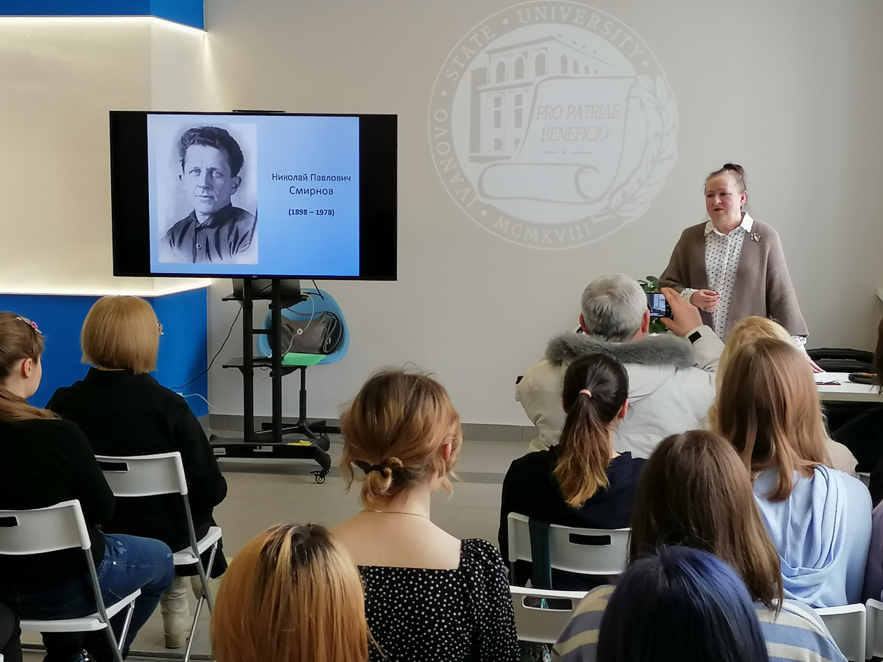 Анна Александровна увлекательно рассказала о непростом жизненном и творческом пути Н.П. Смирнова, редактора журналов «Новый мир» и «Охотничьи просторы» времен серебряного века русской литературы, политического ссыльного и фронтовика, познакомила с его поэтическим, прозаическим и эпистолярным наследием и обратилась к слушателям с призывом изучать творчество Н.П. Смирнова как одного из ярких и самобытных писателей Ивановского края.