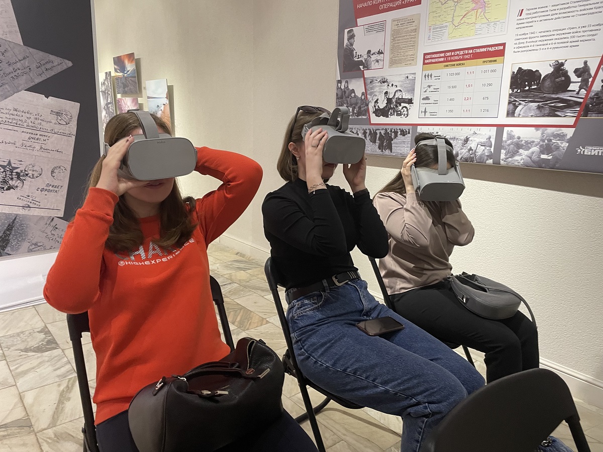 Сталинградская битва – один из важнейших этапов Великой Отечественной войны и, безусловно, рассказ о ней, жизни героев в период боевых действий и между ними, оставил, по словам студентов, неизгладимое впечатление. Кульминацией экскурсии стала VR-прогулка на Мамаев Курган. VR-полет к мемориалу Родина-Мать был действительно впечатляющий! С высоты 87 м в панораме 360 градусов можно было увидеть величественный монумент и сам город-герой Волгоград.