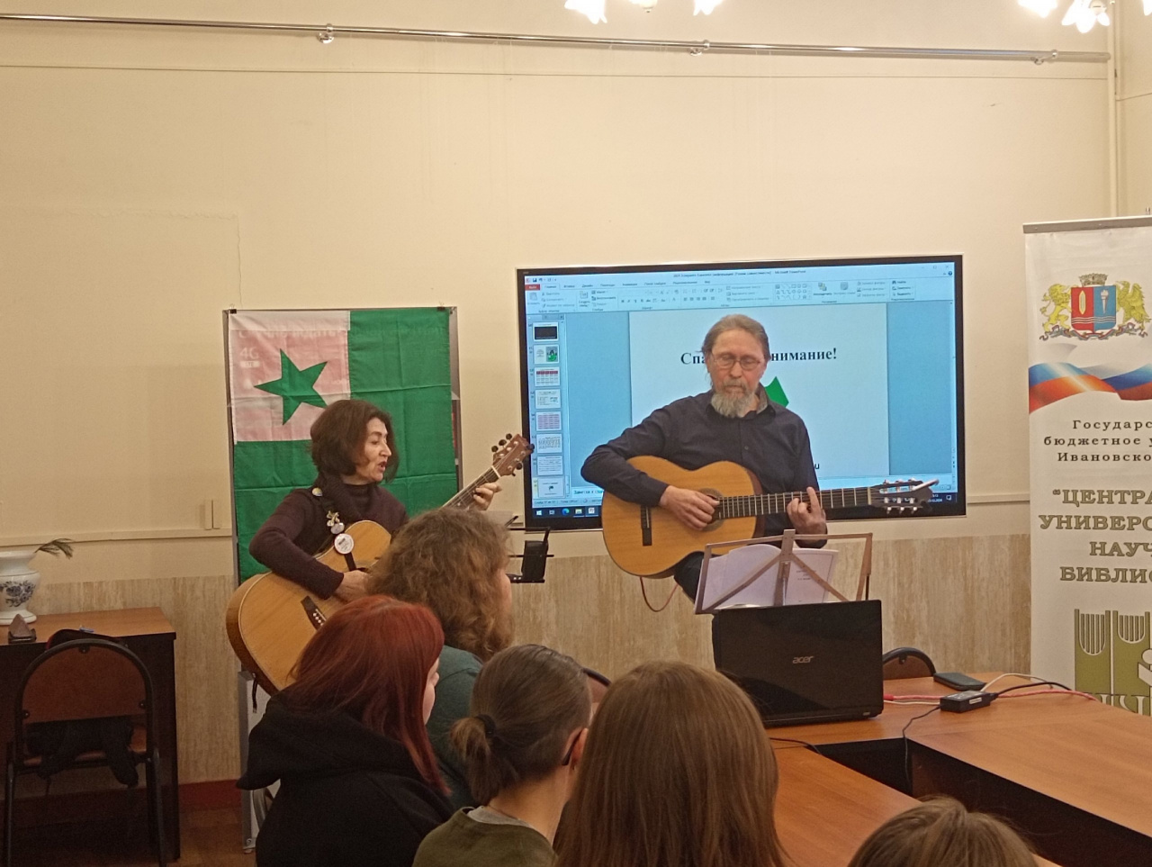 Участники встречи с большим удовольствием послушали песни на эсперанто в исполнении ивановского дуэта «Прогулки по городу».