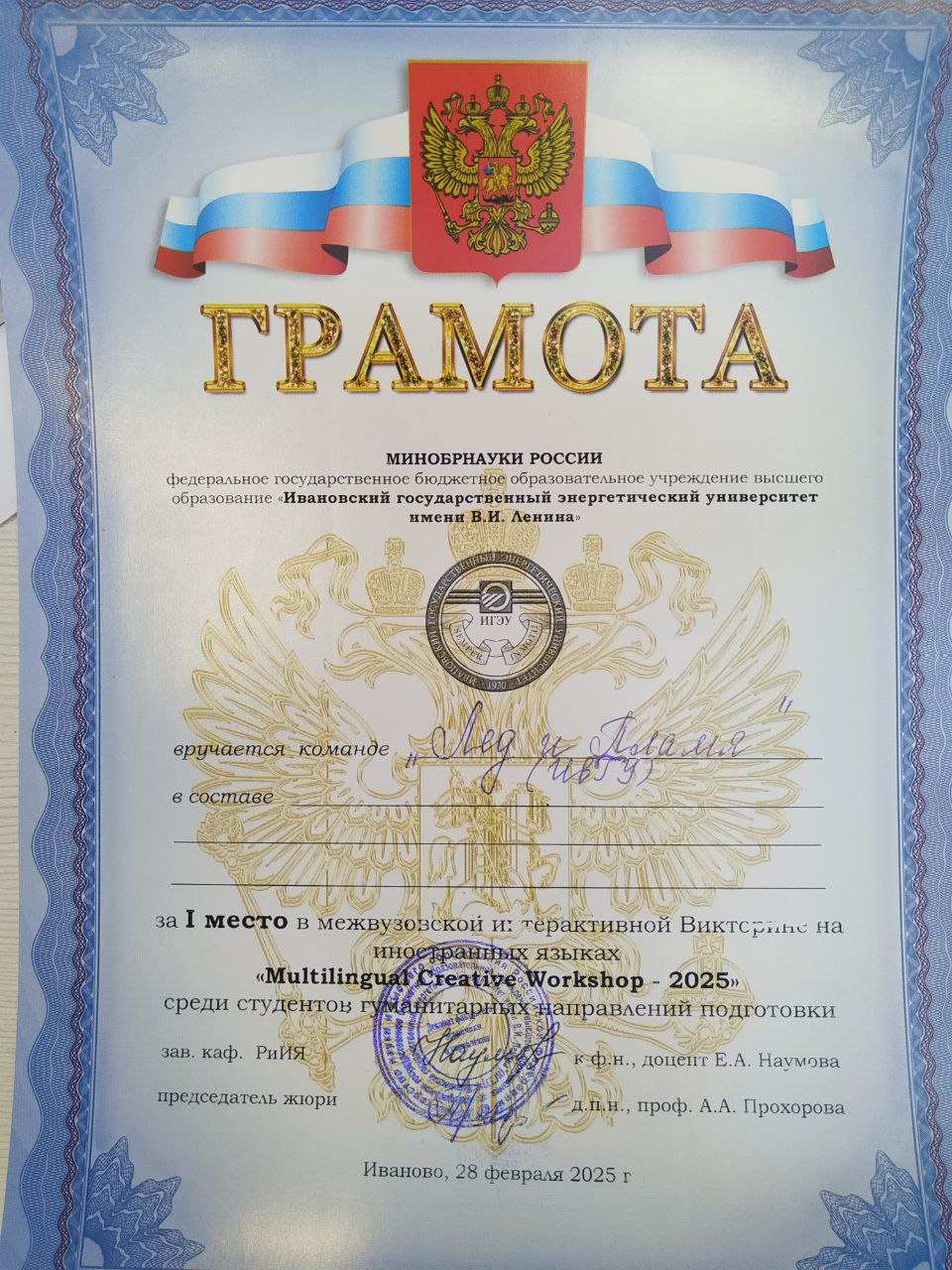 28 февраля 2025 г., в последний день календарной зимы, студенты ИвГУ, ИГЭУ, РАНХиГС (Ивановский филиал) и Шуйского филиала ИвГУ собрались в стенах Ивановского государственного энергетического университета, чтобы поучаствовать в «Мультилингвальной творческой лаборатории». Для участников были предложены задания различного уровня сложности на 5 языках: английском, русском, немецком, французском и испанском. Особенность конкурса в том, что многие студены изучают только один иностранный язык и не знают других. Поэтому поиск правильных ответов превратился в увлекательный квест. Это были задания на поиск соответствий пословиц и поговорок на различных языках, разгадывание кроссвордов, перевод известных песен с одного языка на другой, игра в ассоциации и решение ребусов.