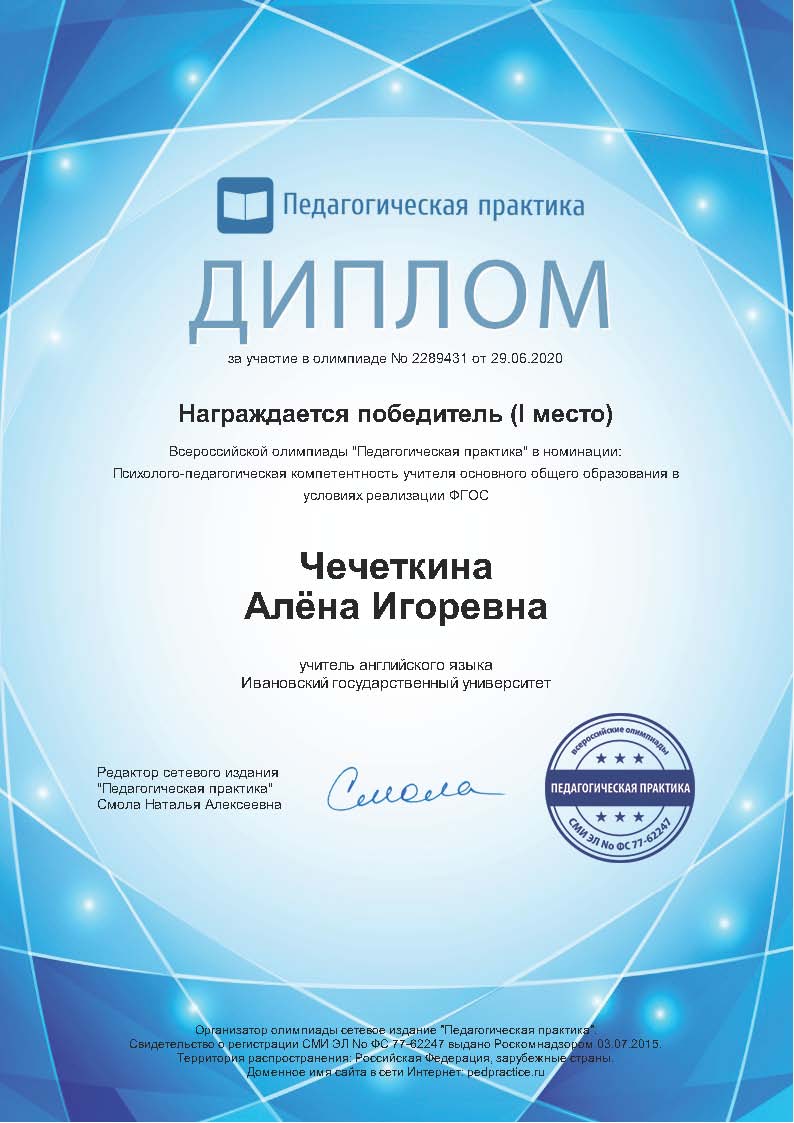 - 1-е место во Всероссийской олимпиаде «Педагогическая практика» в номинации «Психолого-педагогическая компетентность учителя основного общего образования в условиях реализации ФГОС»