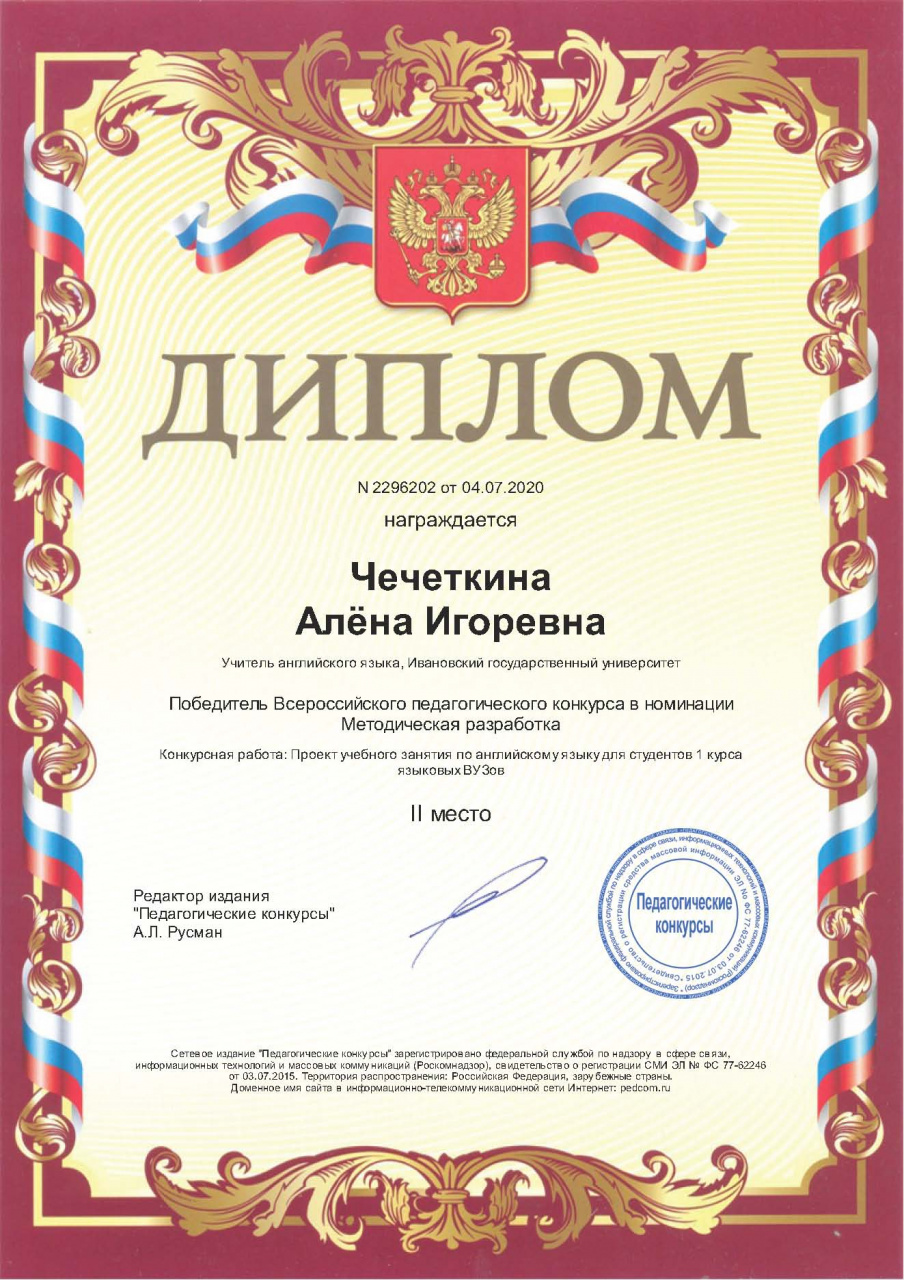 - 2-е место во Всероссийском педагогическом конкурсе в номинации «Методическая разработка: конкурсная работа “Проект учебного занятия по английскому языку для студентов 1 курса языковых вузов”».