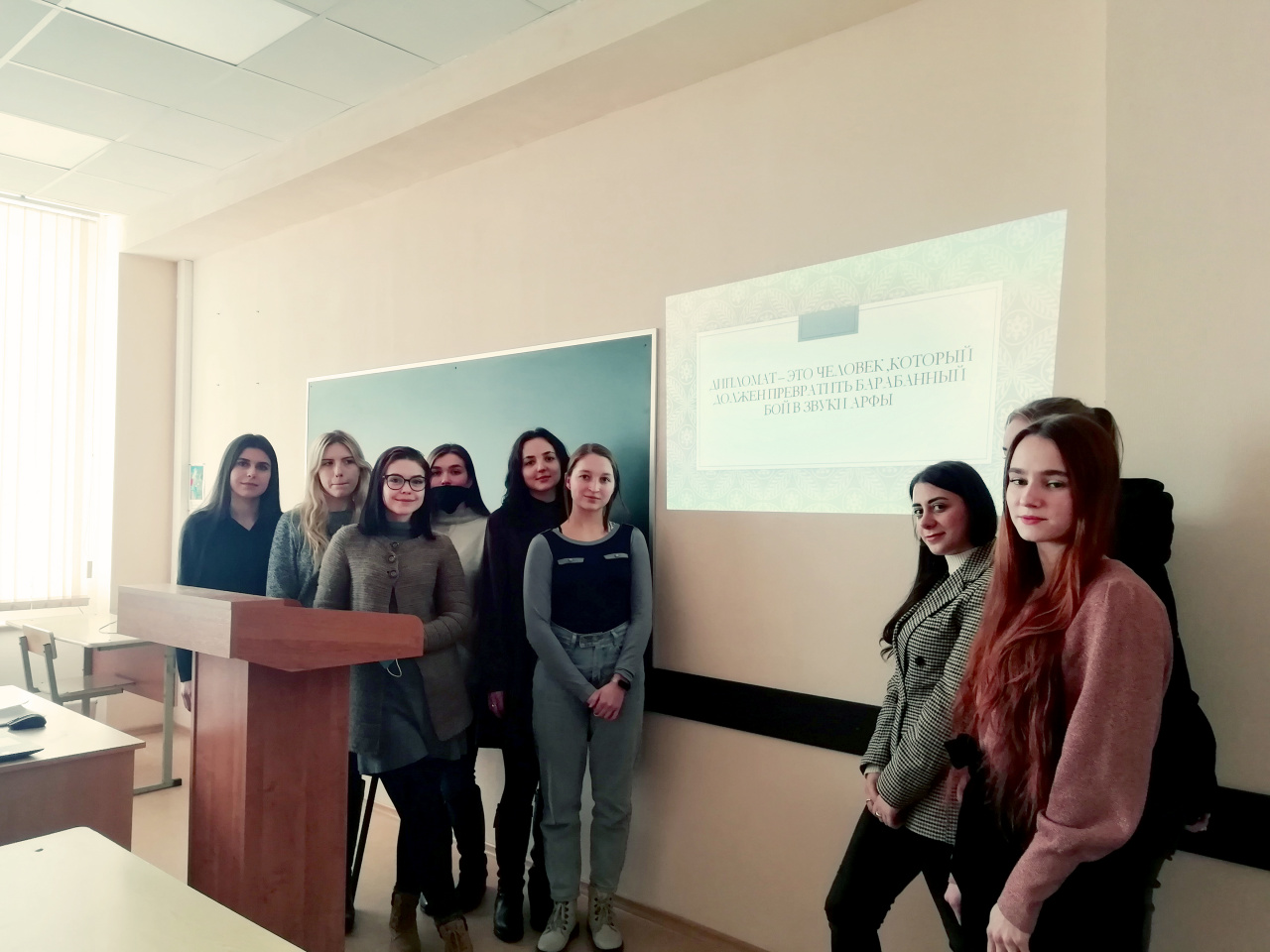 Студенты 4-го курса направления подготовки «Международные отношения» не остались в стороне от празднования столь важного события. Доценты кафедры иностранных языков Е.А. Вансяцкая и Т.А. Таганова подготовили викторину на знание важных и интересных, иногда и забавных и курьезных моментов из истории дипломатии. После этого студенты порассуждали на английском языке о новых вызовах, с которыми сегодня приходится сталкиваться дипломатам, о глобальных проблемах, роли международных организаций в современном мире. Дискуссия получилась оживленной и интересной. А главное, студенты доказали, что они прекрасно владеют как английским языком, так и своей специальностью: четверокурсники продемонстрировали широкий профессиональный кругозор, интерес к выбранной профессии, неравнодушие и умение вести аргументированную беседу. Мы уверены, что на дипломатическом поприще и в международной деятельности наши ребята окажутся истинными патриотами, знающими и любящими свое дело профессионалами.