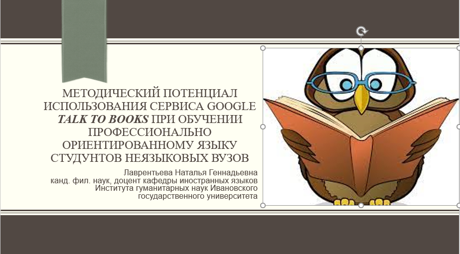 Доцент кафедры иностранных языков Института гуманитарных наук Н.Г. Лаврентьева прошла конкурсный отбор для участия в конференции и представила доклад на секции «Обучение иностранному языку для специальных и академических целей в новой образовательной реальности» на тему «Методический потенциал использования сервиса Google Talk to Books при обучении профессионально ориентированному языку студентов неязыковых вузов».