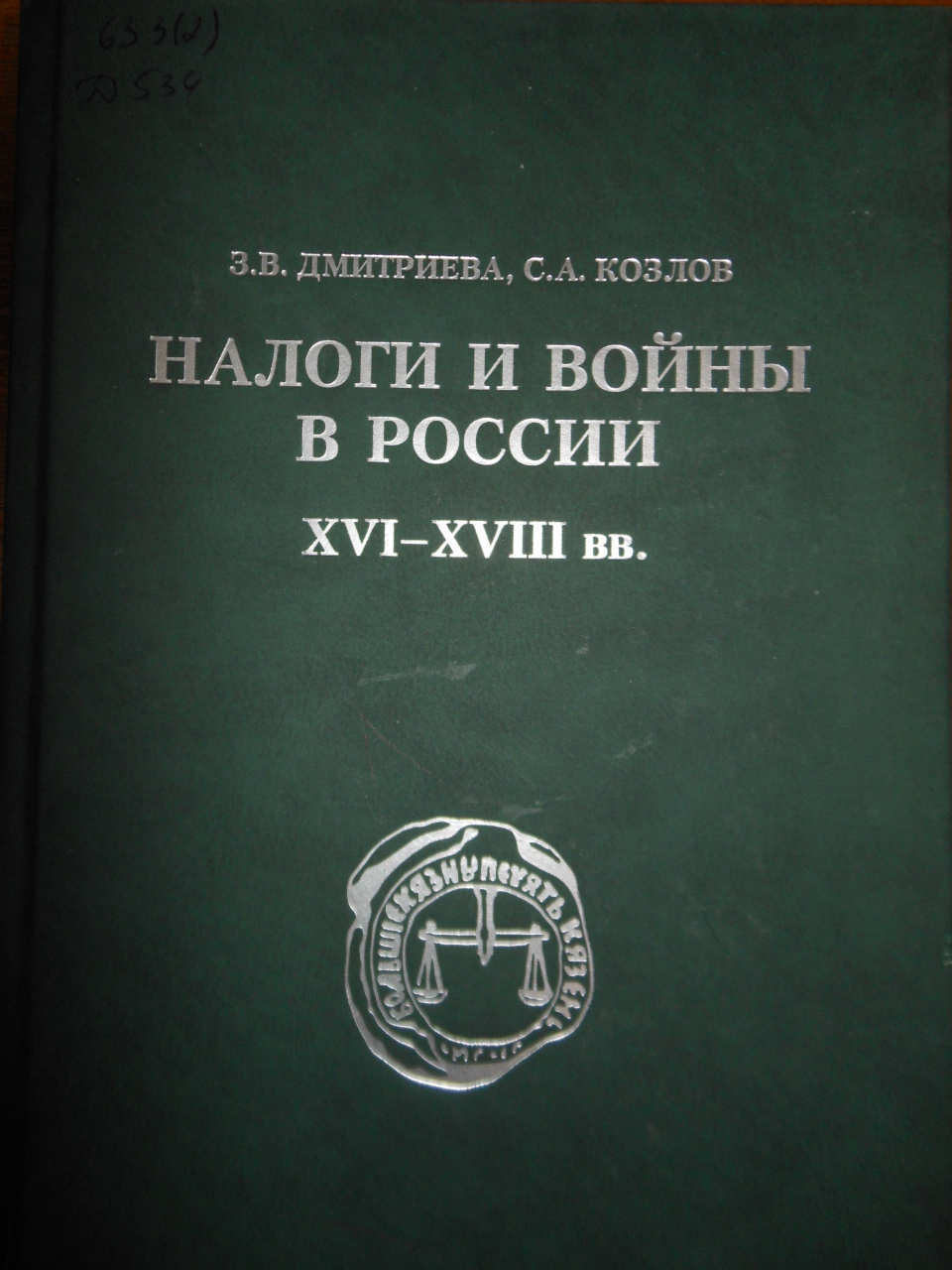 Следующей книгой, изданной также при поддержке РФФИ, является монография Дмитриевой З.В. и Козлова С.А. «Налоги и войны в России ХVI–XVIII вв.», вышедшая в Санкт-Петербурге в издательстве «Историческая иллюстрация». Издание пополняет серию книг Библиотеки Фонда памяти светлейшего князя А.Д. Меншикова и посвящено 50-летию выхода в свет в 1971 году первого тома коллективного труда под рук. А.Л. Шапиро по аграрной истории Северо-Запада России 2-й половины ХV–XVII в. В монографии рассматривается история российского налогообложения ХVI–XVIII вв. в контексте проблемы «налоги – войны», показана степень влияния геополитических факторов на изменение налоговых форм и фискальных приоритетов Российского государства; роль общины в формировании системы налогообложения; определена доля военных расходов в государственном бюджете России и европейских стран.
