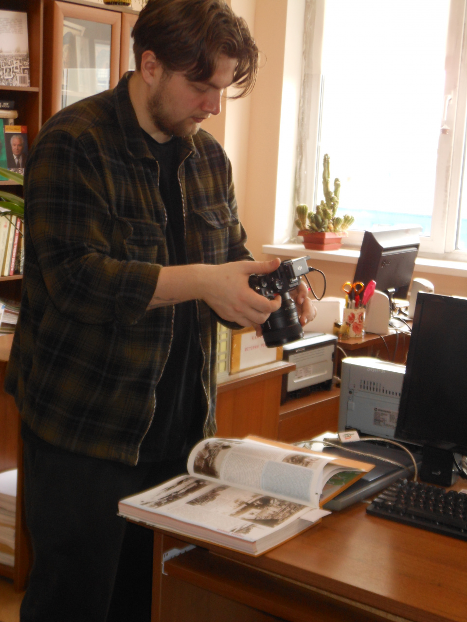 А в пятницу, 17.04, он стал съёмочной площадкой для студентов нашего вуза. Готовясь к мероприятиям в рамках фестиваля «Студенческая весна – 2026» и посвящённых 155-летию основания нашего города, студенты-журналисты, экономисты и международники взяли интервью у проф. К.Е. Балдина и проф. В.С. Околотина – известных в нашем регионе авторов краеведческих изданий и материалов, посвящённых трудовым и ратным подвигам наших земляков в Великой Отечественной войне. Как раз эти издания и стали предметом внимания начинающих документалистов.