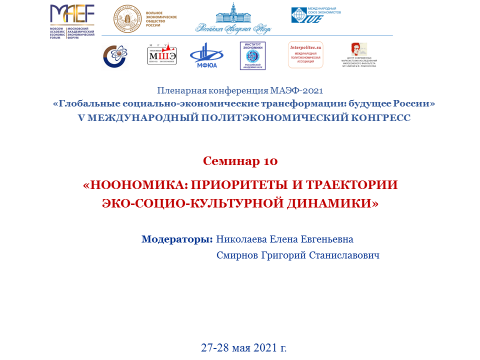 27–28 мая 2021 г. проводилось сразу два научных форума. Это V Международный политэкономический конгресс «Глобальные социально-экономические трансформации: будущее России» (г. Москва) в рамках Московского академического экономического форума (МАЭФ) и Национальная научная конференция с международным участием «Глобальный мир и ноосферная безопасность России» (г. Иваново, ИвГУ). В рамках этих научных мероприятий 28 мая прошел семинар (секция) «Ноономика: приоритеты и траектории эко-социо-культурной динамики». Модератором секции выступила доктор экономических наук, доцент, и.о. зав. кафедрой экономической теории, экономики и предпринимательства Николаева Елена Евгеньевна. Она представила доклад «Концепция ноономики и современная модель общественного воспроизводства».