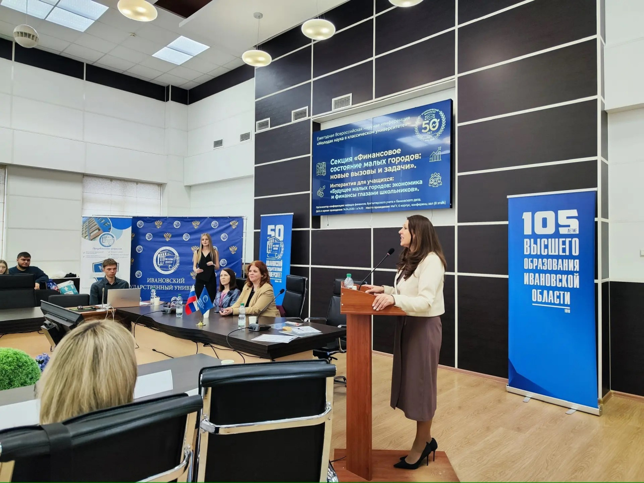 Вести работу секции предоставили студентке 4 курса направления 38.03.01 Экономика (Финансы и кредит) Александре Кузьминой, стипендиату Правительства Российской Федерации. Она рассказала о научно-исследовательской работе, которую уже третий год подряд проводят студенты 3 курса образовательной программы «Финансы и кредит» под руководством И. В. Курниковой по финансам малых городов нашей области. Они знакомятся не только с финансовой составляющей малого города, но и его историей, и предлагают перспективы их развития. В докладах затронуты насущные проблемы и специфика Кинешмы, Тейкова, Фурманова, Кохмы, Юрьевца, а также столицы нашего региона – г. Иваново. Выступления студентов явились результатом очень серьезной работы по сбору и анализу информации, основанной на показателях бюджетов муниципальных образований. По итогам исследования были предложены мероприятия, направленные на улучшение ситуации и дальнейшее развитие.