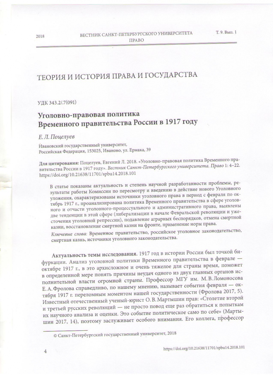 В апреле 2018 г. в «Вестнике Санкт-Петербургского университета» (Право. Т.9. Вып. 1. С. 4–22, примерно 1,5 п.л.) опубликована большая статья заведующего кафедрой теории и истории государства и права юридического факультета ИвГУ Евгения Леонидовича Поцелуева. Ее электронная версия находится в свободном доступе по адресу.
