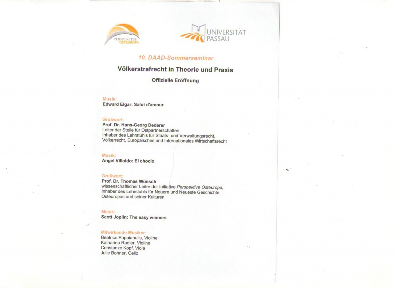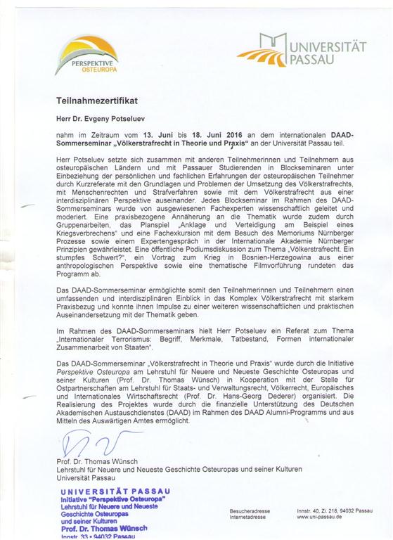 Работа семинара продолжалась с 13 по 18 июня 2016 г. включительно. Рабочий язык – немецкий. Во время открытия звучала живая музыка. С официальным приветствием ко всем присутствующим обратились профессора – Ханс-Георг Дедерер, руководитель представительства «Восточное партнерство», и научный руководитель Инициативы «Перспективы Восточной Европы» Томас Вюнш. Во время его работы все были поделены на мини-группы, каждая из которых решала конкретные задачи, например, с законностью операции по уничтожению спецподразделением США Бен Ладена на территории суверенного государства – и т.п. За это время все участники выступили с докладами. Доклад Е.Л. Поцелуева был посвящен международному терроризму, продолжался более 20 минут и сопровождался презентацией. Перед участниками выступали ученые из университетов ФРГ (Мюнхен, Пассау и Регенсбург), Нидерландов и США. Прекрасными руководителями были доктора, профессора Университета Пассау Ханс-Георг Дедерер, Хольм Путцке, Роберт Эсер и др.