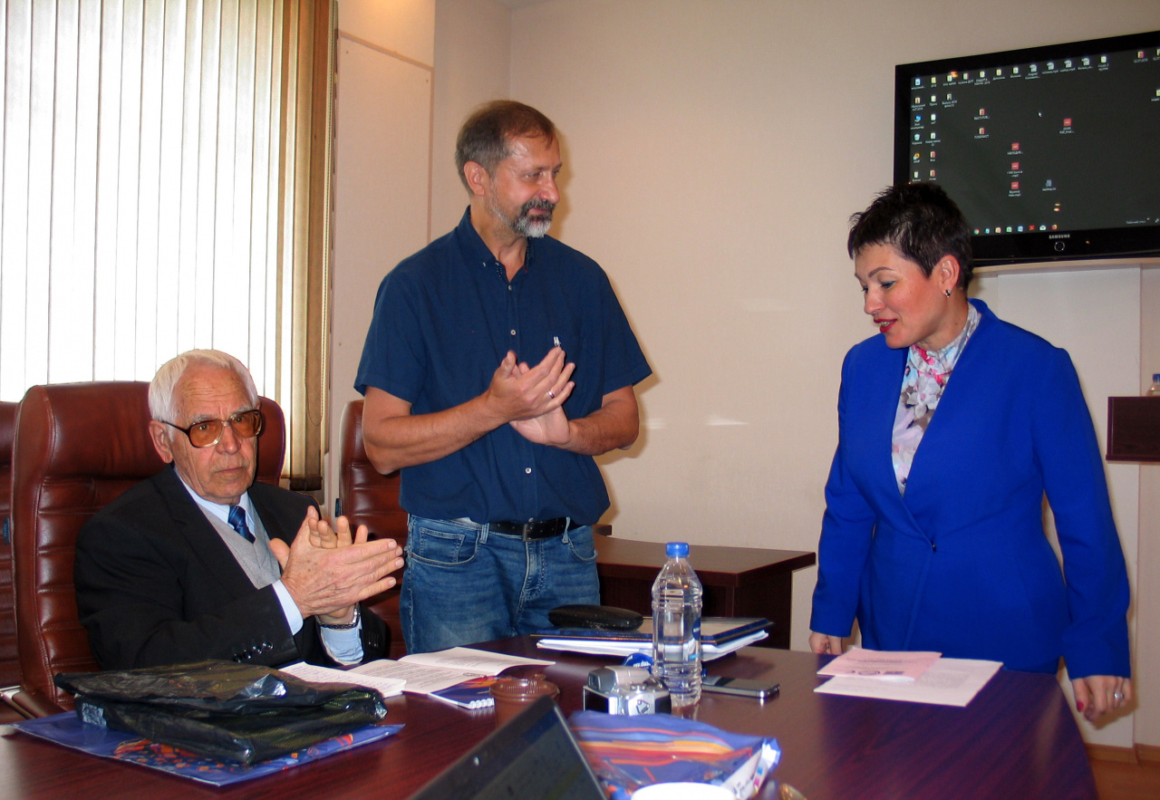 ВРИО ректора ИвГУ С.А. Сырбу поздравляет Е.Л. Поцелуева с 25-летием работы в ИвГУ. 20.09.2019. Фото М. Алферовой
