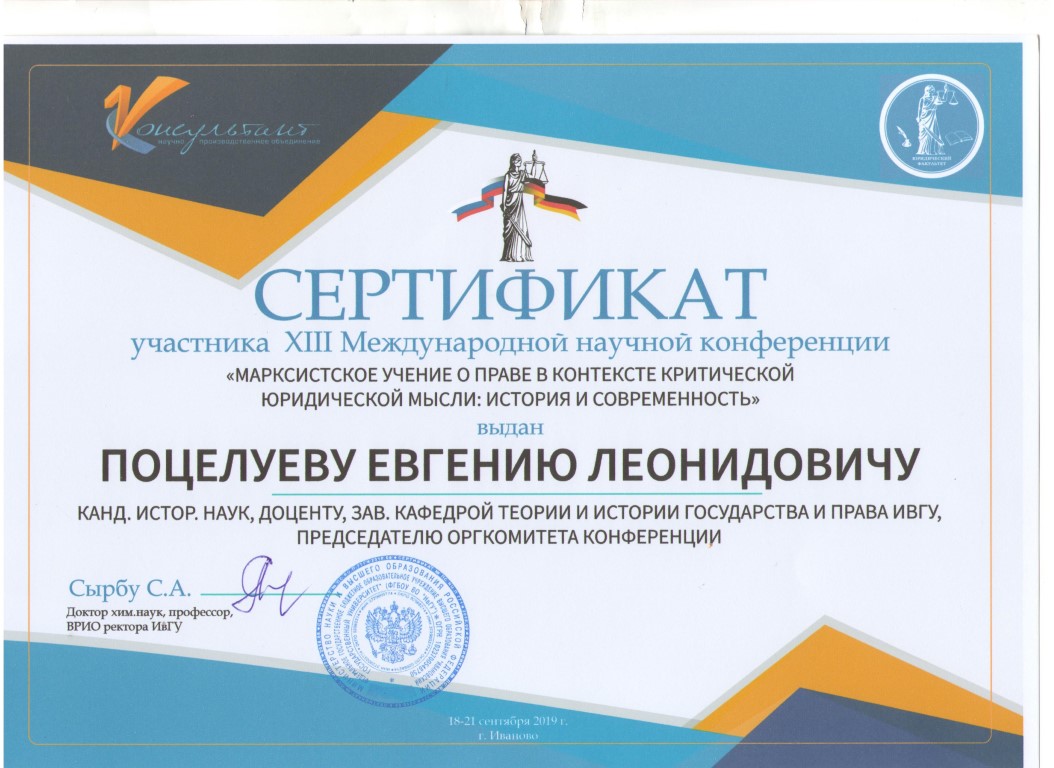 20–21 сентября 2019 года, в комфортном и уютном конференц-зале ИвГУ на улице Ермака, состоялась 13-я Международная научная конференция «Марксистское учение о праве в контексте критической юридической мысли: история и современность», организованная, как и все предыдущие, по инициативе и при активном участии кандидата исторических наук, доцента, заведующего кафедрой теории и истории государства и права ИвГУ, основателя и бессменного руководителя межвузовского Центра немецкого права, члена Ивановского отделения Ассоциации европейских исследований и Международного института философско-правовых исследований Белорусского государственного экономического университета (г. Минск, Республика Беларусь) Евгения Леонидовича Поцелуева.
