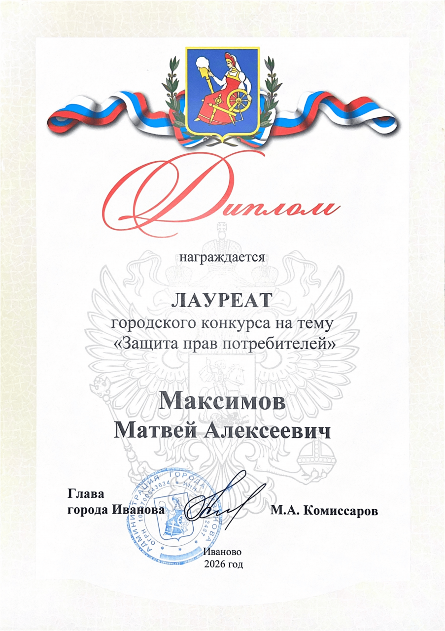 Студент 3 курса бакалавриата юридического факультета Ивановского государственного университета Максимов Матвей стал лауреатом городского конкурса на тему «Защита прав потребителей». Торжественная церемония награждения победителей конкурса, которые были отмечены дипломами и ценными подарками, прошла в Администрации города Иванова.
