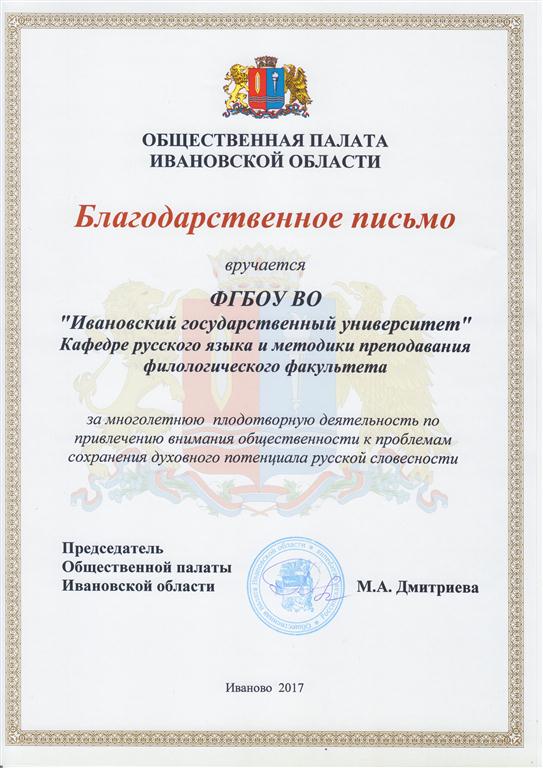 Председатель Общественной палаты Ивановской области М. А. Дмитриева вручила кафедре русского языка и методики преподавания в лице заведующего кафедрой профессора И. А. Сотовой благодарственное письмо Общественной палаты Ивановской области «за многолетнюю плодотворную деятельность по привлечению внимания общественности к проблемам сохранения духовного потенциала русской словесности».