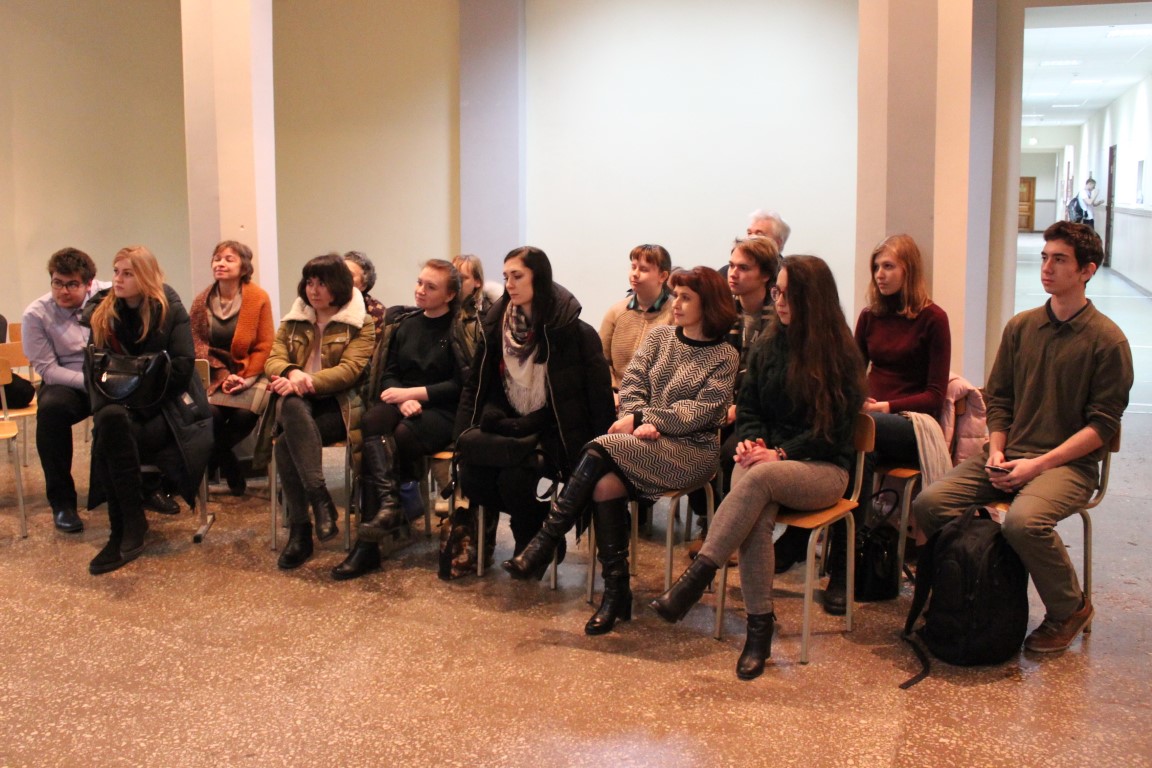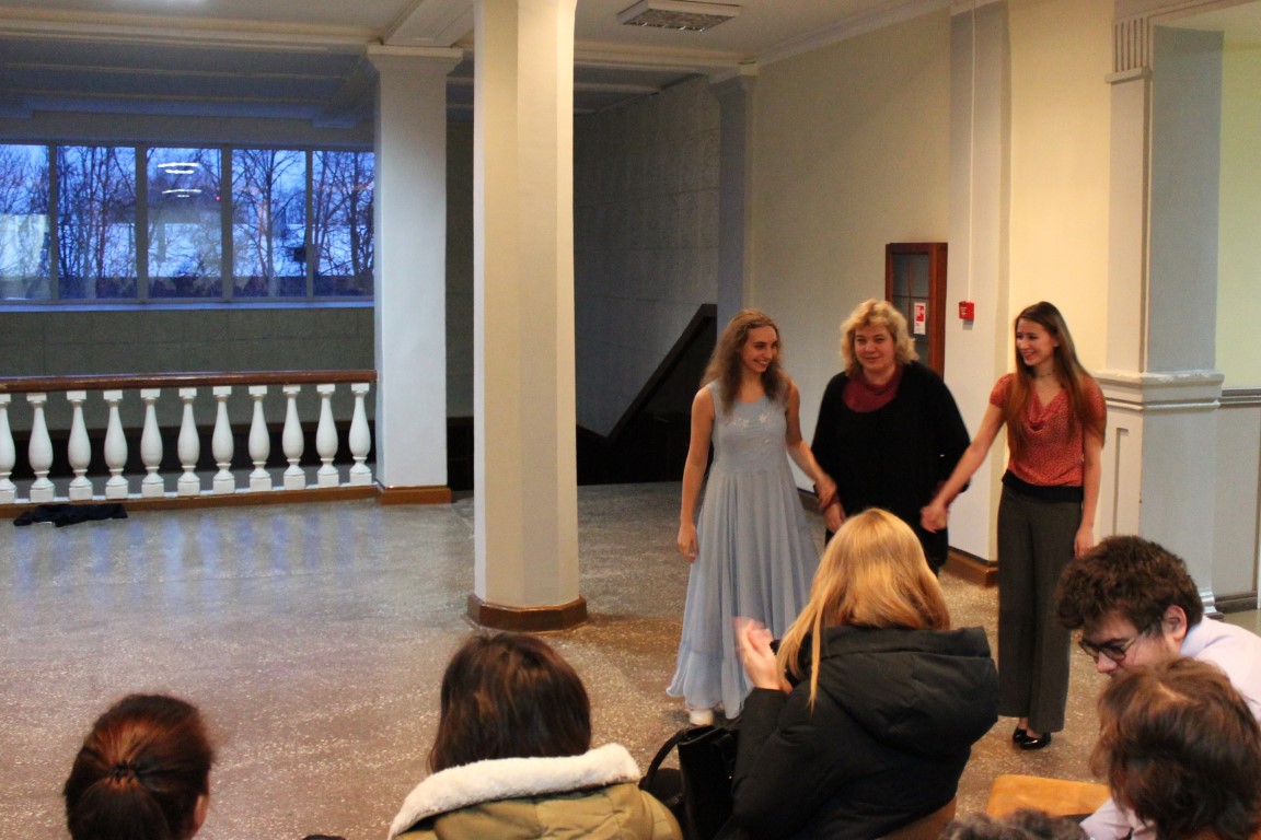 На этот раз зрители разместились среди колонн в холле 4-го этажа, где восхитительная акустика и закат в окне поспорит с иной декорацией.