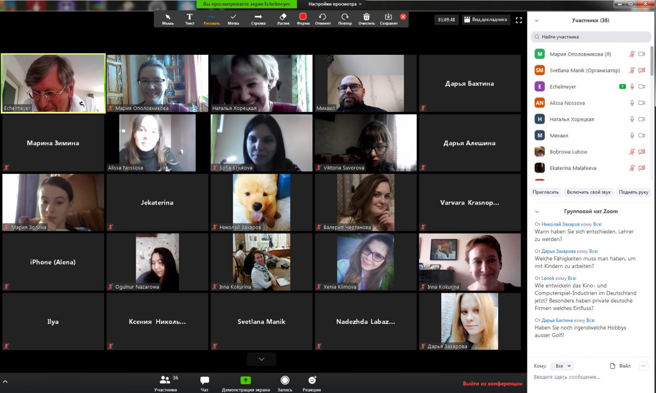 Во время онлайн-встречи, которая состоялась 29 апреля, студенты получили прекрасную возможность обсудить на немецком языке актуальную общественно-политическую обстановку в Германии и другие интересующие их темы. Студенты активно задавали вопросы как устно, так и в чате, и господин Эхельмайер с удовольствием отметил, что участники видеоконференции владеют немецким языком на высоком уровне.