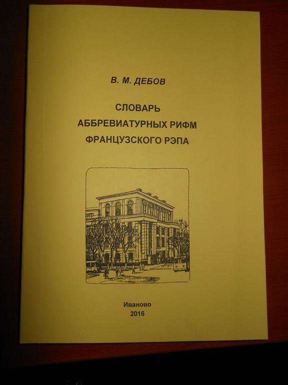 В декабре 2016 года в издательстве «Ивановский государственный университет» вышел новый словарь доцента В.М. Дебова под названием «Словарь аббревиатурных рифм французского рэпа». Валерий Михайлович продолжительное время занимается изучением языка молодежи современной Франции. Настоящее издание – своеобразный итог работы, посвященной специфике рэпа. Как указывает в предисловии сам автор, им предпринята «первая попытка отечественного исследования и лексикографического описания оригинальных рифм с участием сокращенных слов французского языка, характеризующих рэп-произведения наиболее популярных групп и исполнителей Франции конца ХХ и начала ХХI века». Издание адресовано всем интересующимся французским языком, в первую очередь специалистам-романистам, преподавателям и переводчикам французского языка, студентам старших курсов специальных факультетов вузов, а также лицам, владеющим французским языком и интересующимся динамикой и спецификой стихотворчества современной французской молодежи.