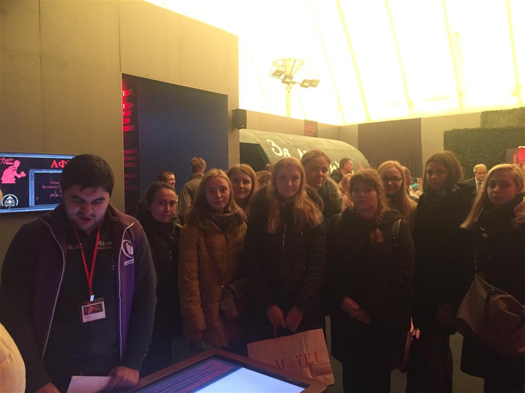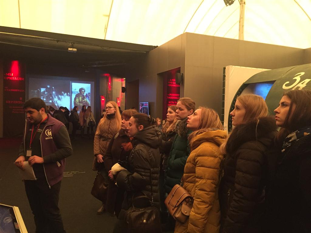Хотя формат выставки преимущественно электронный, студентов встретили замечательные волонтеры: студенты исторического факультета, которые провели по залам, рассказали много нового и интересного. С помощью самых современных технологий, уникальных видео- и фотоматериалов, рассекреченных документов и неизвестных артефактов военной поры студенты познакомились с настоящей историей и попытками ее фальсификации. Выставка дала возможность побывать в блиндаже, в окопах, в салоне настоящего бомбардировщика и увидеть, как сбрасывали бомбы на Берлин. А затем с помощью тач-скринов они смогли самостоятельно изучить все мифы о Великой Отечественной, накопившиеся за последние 30 лет, и сделать собственные выводы. В противовес мифам – тысячи страниц фактов, фото, документов. Дополнительным путеводителем здесь служит знаменитая книга Владимира Мединского «Война».