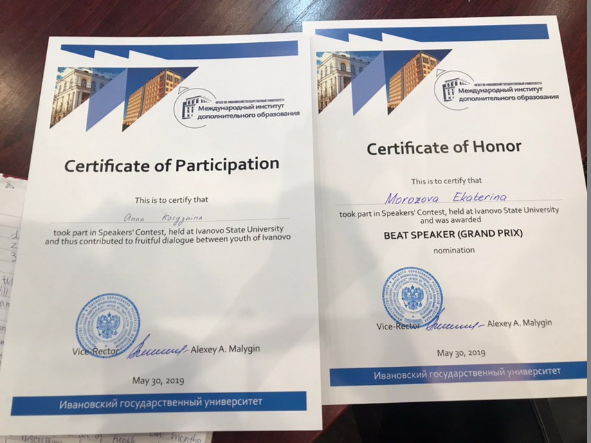 30 мая 2019 года кафедрой английского языка ИвГУ совместно с Международным институтом дополнительного образования ИвГУ был проведен конкурс ораторов на английском языке. Студенты кафедры английской филологии факультета РГФ приняли участие в данном мероприятии. Екатерина Морозова, студентка 3 курса, получила Гран-при, а Анна Косыгина, студентка 3 курса, была отмечена дипломом. Поздравляем участников с отличным результатом и желаем не останавливаться на достигнутом!