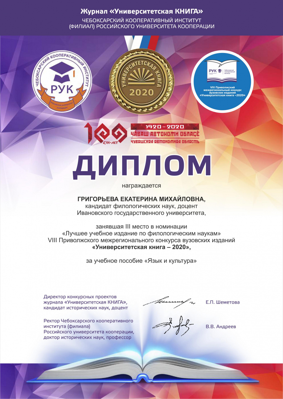 В конкурсе приняла участие доцент кафедры английской филологии ИвГУ Е.М. Григорьева. В номинации «Лучшее учебное пособие по филологическим наукам» она заняла третье место за учебное пособие «Язык и культура». Поздравляем автора и желаем новых научных достижений!