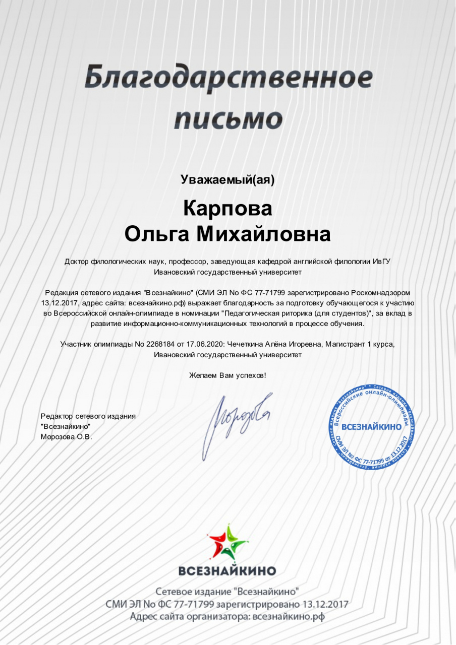Научным руководителем Алены выступила заведующая кафедрой английской филологии, д.ф.н., проф. О.М Карпова.