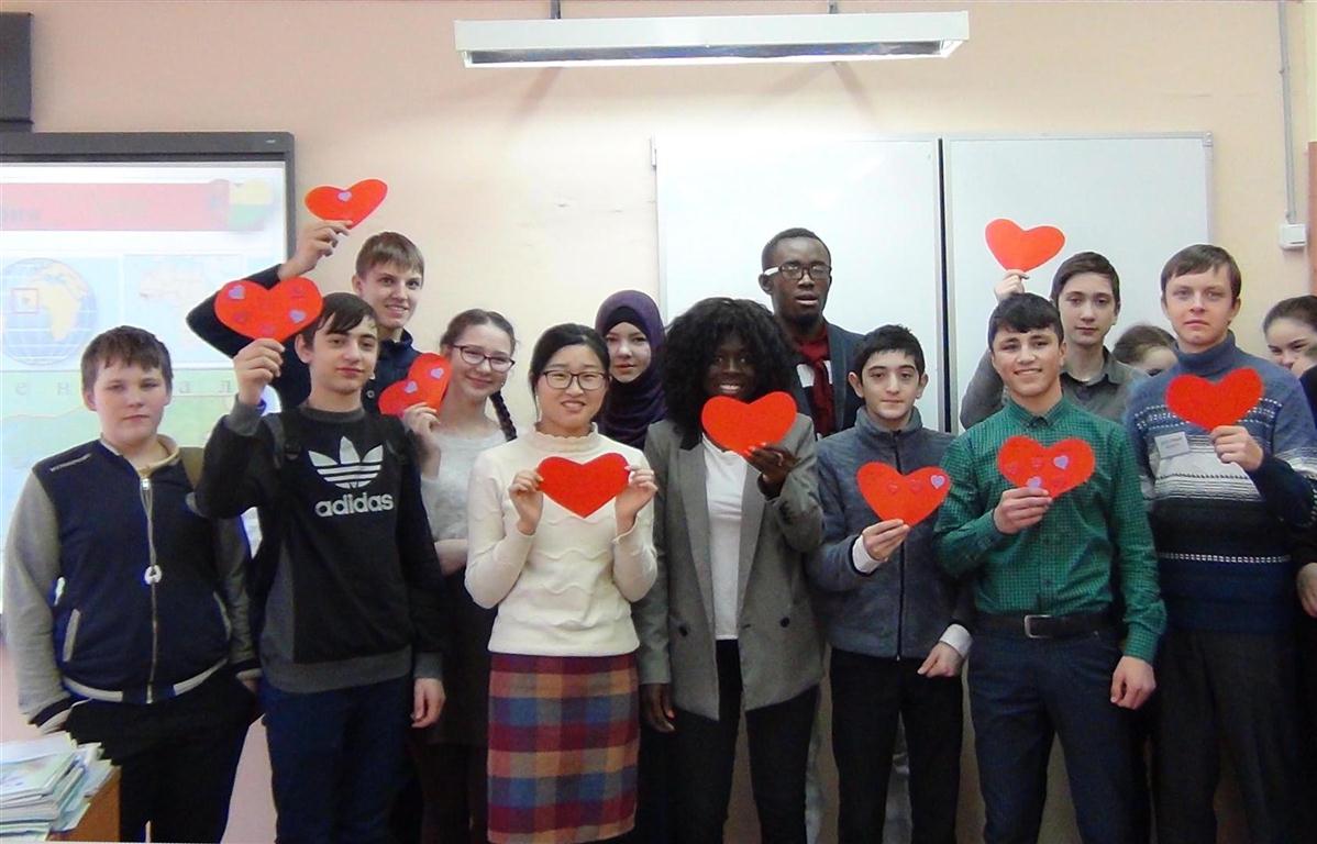 Не менее удачно прошли занятия и 9 февраля (в четверг), в результате которых ребята познакомились с лингвокультурными особенностями разных стран Африки – Гвинеи-Бисау и Конго. Гомеш Нинфа Симао (Гвинея-Бисау) познакомила учеников 8 «А» класса с историей и особенностями празднования Дня святого Валентина в Гвинее-Бисау (во время мастер-класса она научила ребят некоторым поздравительным фразам на португальском языке), а Ебонги Ломиги Мареш Каршелэн (Конго) рассказал ученикам 7 класса об истории колонизации Конго и о том, как отмечают один из самых важных для всех конголезцев праздников – День независимости (во время мастер-класса школьники изготовили красочные флажки Конго и научились фразам не только на французском языке, но и на национальных языках – лингала и китуба).