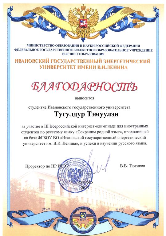 В марте этого года на базе ФГБОУ ВО «Ивановский государственный энергетический университет имени В. И. Ленина» была проведена III Всероссийская интернет-олимпиада для иностранных студентов по русскому языку «Сохраним родной язык», в которой, как и в прошлом году, приняли участие несколько бакалавров (нефилологов) первого и второго курсов Ивановского государственного университета. К сожалению, призовые места наши студенты не заняли, однако студентка третьего курса социолого-психологического курса Тэмуулэн Тугулдур, участвовавшая на внеконкурсной основе, успешно справилась со всеми заданиями и получила благодарность.