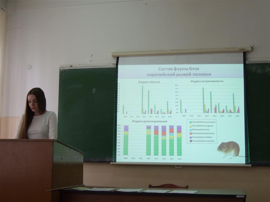 2 место – студентка 2 курса магистратуры Капустина Е.П. («Сравнительный анализ фауны блох мелких млекопитающих в окрестностях Рубского озера за 2012–2016 гг.»; научный руководитель: канд. биол. наук, доц. Чудненко Д.Е., ИвГУ);