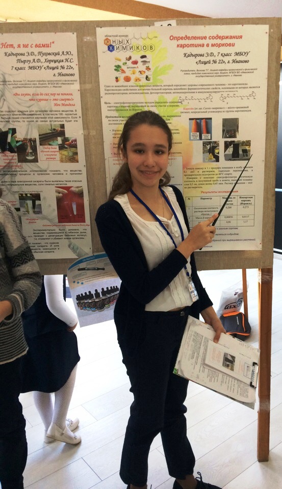 Лицей № 22 представляли семиклассники Надя Хорецкая, Элина Кадырова, Антон Пырэу и Андрей Пуховский, работающие в группе под руководством доцента кафедры органической и физической химии ИвГУ Волковой Татьяны Геннадьевны. На строгий суд жюри было представлено в секции «Первые шаги в науку» три работы: